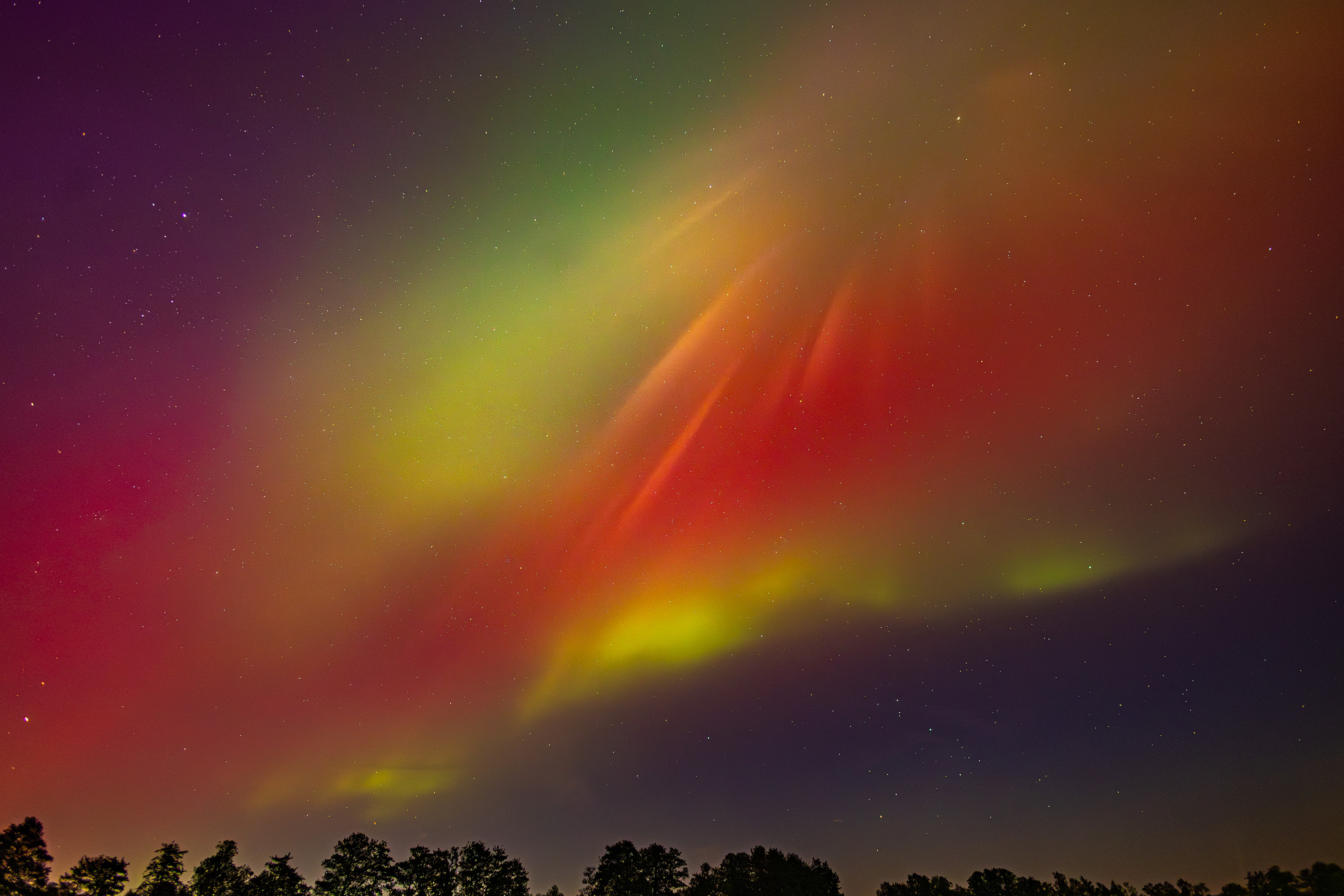 Selbst das Rot und Violett war mit bloßem Auge erkennbar und auch die Landschaft war aufgehellt während dieser sehr aktiven Phase. Besonders auffällig war der helle Strahl ganz außen.