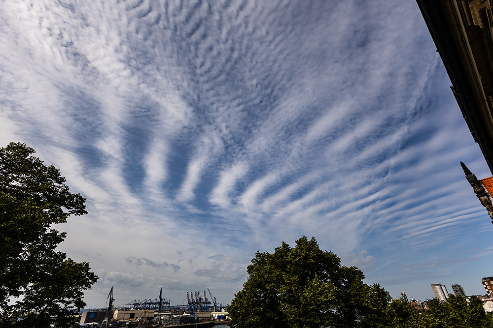 Die flache Tiefdruckrinne kommt weiter nach Deutschland voran. Die Luft ist zwar sehr energiereich (CAPE-Werte teilweise über 2000 J/kg!) und es gibt auch gewisse Konvergenzen im Bodendruckfeld, doch der Höhenrücken sorgt durch Absinken nach wie vor für einen sehr starken Deckel, sodass es zu keiner Auslöse von Konvektion kommt. Auf den Nordwesten Deutschlands greift im Laufe des Tages eine kaum aktive Kaltfront über. Dort kann vielleicht dann doch etwas ausgelöst werden, wenn dann aber nur sehr lokal. Ansonsten bleibt es heiß und teils sehr schwül. Heute sonnig, wenn nicht sogar wolkenlos. Erst am Abend zeigte sich mal etwas Cirrocumulus (Bild), welcher sich teils in Altocumulus umwandelte. Nach sehr lauen 18°C am Morgen stieg die Temperatur wieder rasant an und erreichte sehr heiße 37,7°C, womit der nächste Wüstentag erreicht wurde. Bei Taupunkten teils um oder gar über 20°C war es drückend schwül. Am Abend blieb es lange sehr warm. |