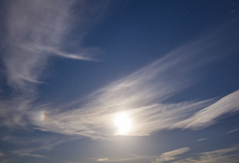 Immer wieder Durchzug von Cirrus und Cirrostratus. Am fast noch vollen Mond gab es einen linken Nebenmond (Bild 1). Morgens dann mal etwas weniger Gewölk und es konnte die