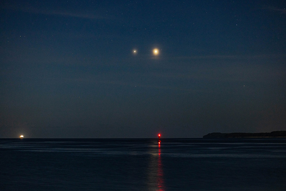 Konjunktion von Venus und Jupiter beobachtet werden (Bild 2). Abends zeigten sich dann an der Sonne beide Nebensonnen in Cirrus (Bild 3). Nach frischer Nacht wurde es warm. |