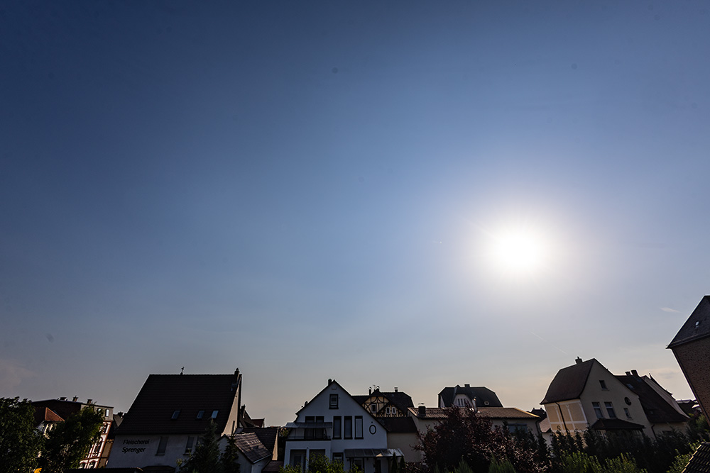 Die gestrige Kaltfront kommt nach Südosten voran. Da rückseitig der Front der Druck bereits wieder stark ansteigt und die Front auch von Kaltluftadvektion (KLA) überlaufen ist, ist die Front nicht wirklich wetteraktiv. Einzig im Süden und Südosten wird der starke Deckel etwas abgebaut und es kommt zu etwas mehr Konvektion. Hinter der Front fließt weniger heiße, aber dennoch sehr warme Luft ein. Heute wieder häufig wolkenlos (Bild), die Kaltfront machte sich fast gar nicht bemerkbar. Am Abend sank die Temperatur etwas schneller ab und die Luft wurde angenehmer, da der Taupunkt merklich zurück ging. Trotzdem war es heute nochmals heiß, die Temperatur stieg von genau 19°C auf maximal 34,2°C an. |