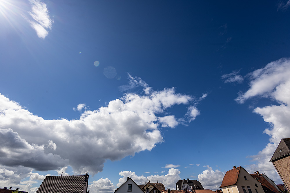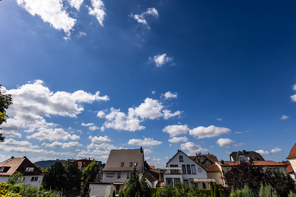 Der Höhentrog wandert nach Osten ab, womit Hoch "Mareike" etwas näher rücken kann. Der Schwerpunkt liegt bis zum Nachmittag über den Niederlanden. Mit nördlicher Strömung wird eine kühle und recht feuchte Luftmasse herangeführt, welche aber zunehmend abtrocknet und sich erwärmt. Die Nacht verlief klar, sodass es gut abkühlen konnte. Am Morgen wurden 6,4°C gemessen. Ansonsten startete der Tag mit viel Sonne und nur wenigen Wolken (Bild). Im Tagesverlauf bildeten sich dann vermehrt Cumuli, welche an einer Absinkinversion breit liefen und sich in Stratocumulus umwandelten. Am Abend klarte es dann wieder auf. Die Temperatur erreichte einen Höchstwert von warmen 24,1°C, ehe es am Abend schnell wieder kühl wurde. |