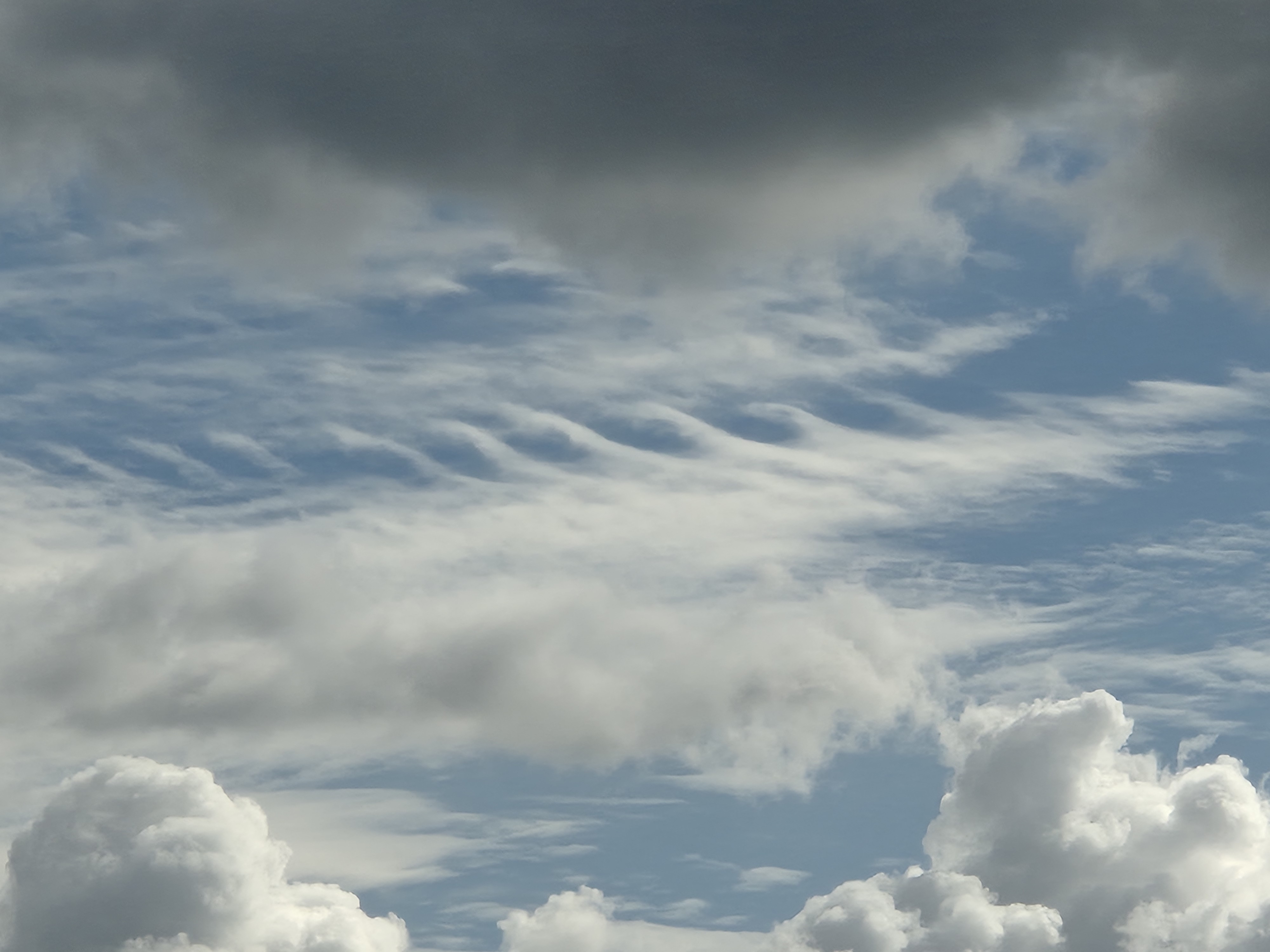 Wie oben beschrieben, gab es kein Astreines sonniges Wetter. Es zogen noch viele Wolkenfelder vorüber. Am Nachmittag konnten seltene Kelvin-Helmholtz-Wellen gesichtet werden (Bild). Es war mäßig-warm. |
