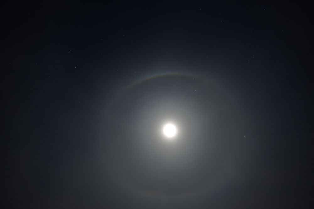 Tagsüber war noch nicht groß Haloaktivität vorhanden, da es die meiste Zeit noch wolkenlos war. Erst gegen Nachmittag zog Cirrus auf, welcher ab dem Abend zunehmend zu Cirrostratus wurde. Halos gab es an der Sonne vorher noch nicht wirklich, einzig ein Abendrot an dem Cirrostratus gab es (siehe dafür das Wettertagebuch März). Erst am Mond ging dann die Haloaktivität los. Bereits nach der ersten Sichtung konnte ein 22°-Ring gesichtet werden, sehr deutlich sogar. Zur besseren Beobachtung ging es dann ins Feld, wo möglichst wenig Licht störte. Denn im Gegensatz zu Halos an der Sonne sind Halos am Mond aufgrund der geringeren Helligkeit schwieriger zu beobachten.Auf dem Weg in das Feld fiel auf, dass es sich nicht nur um den 22°-Ring, sondern auch um den umschriebenen Halo handelte, denn der Halo um den Mond war nicht kreis-, sondern ovalförmig. Im Feld angekommen dann die nächste Überraschung: der Horizontalkreis zeigte sich eindeutig, fast vollständig! Wie das ganze in etwa visuell aussah, soll mit folgendem Bild demonstriert werden: