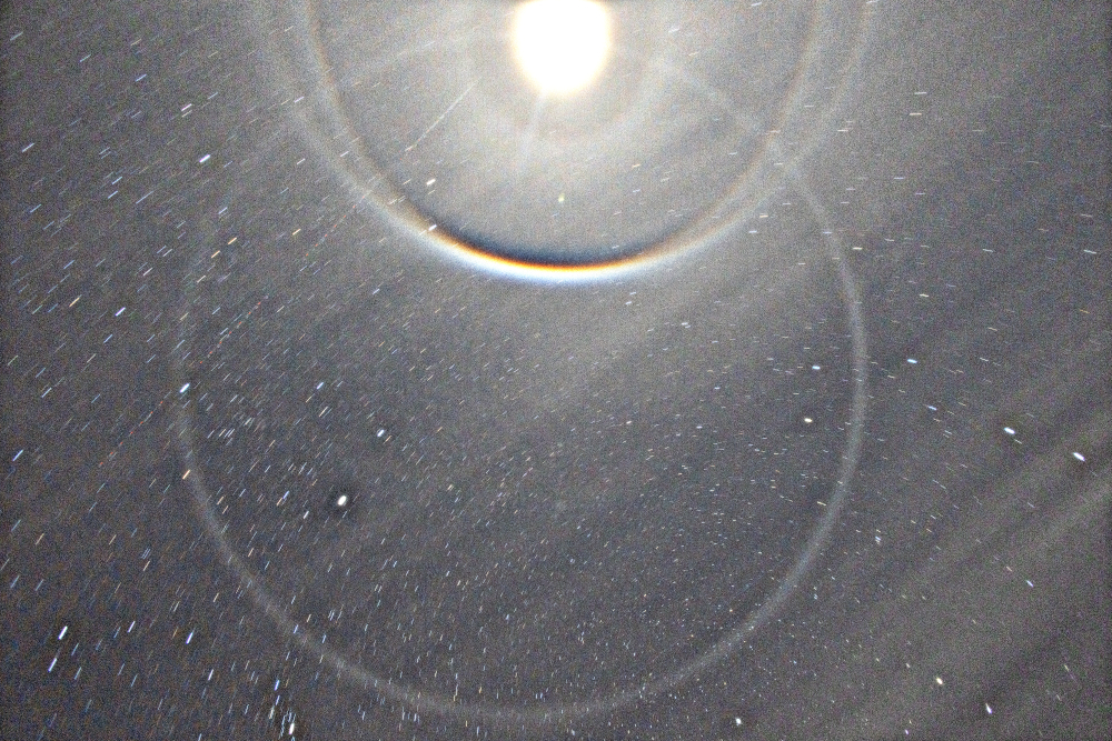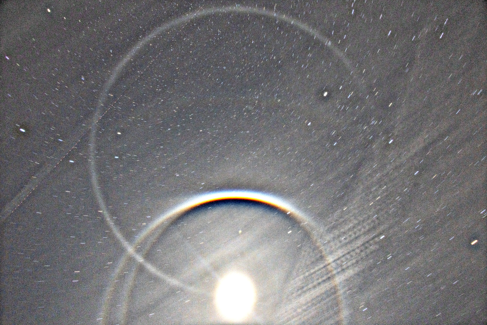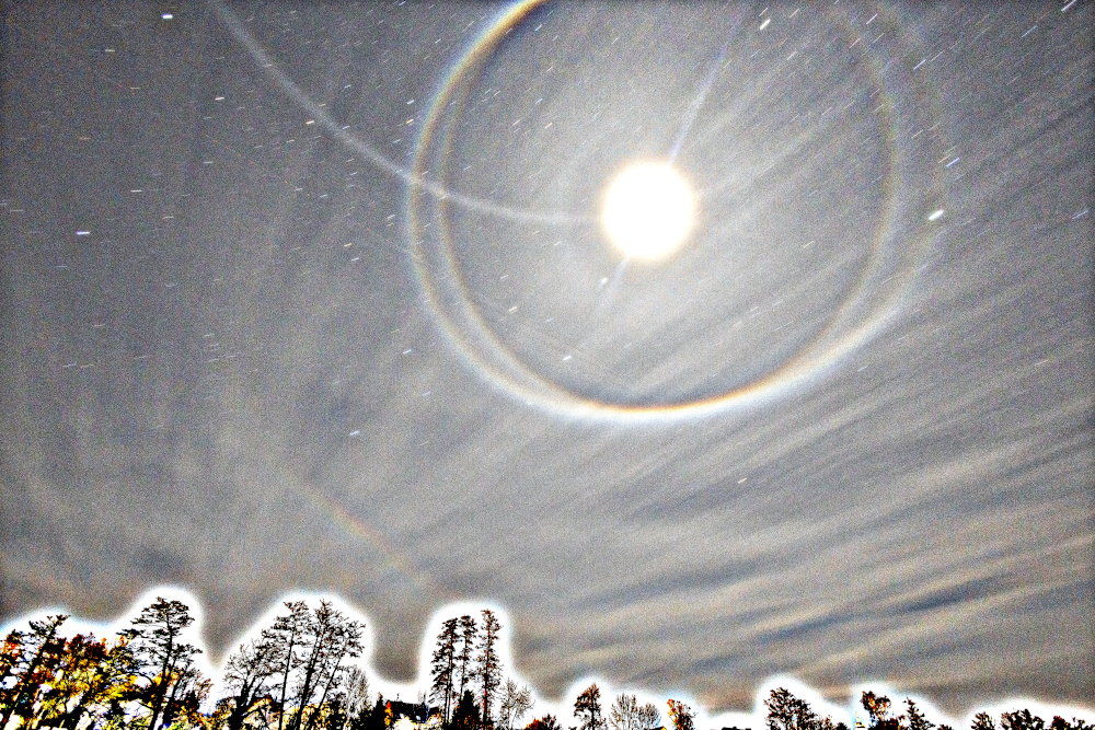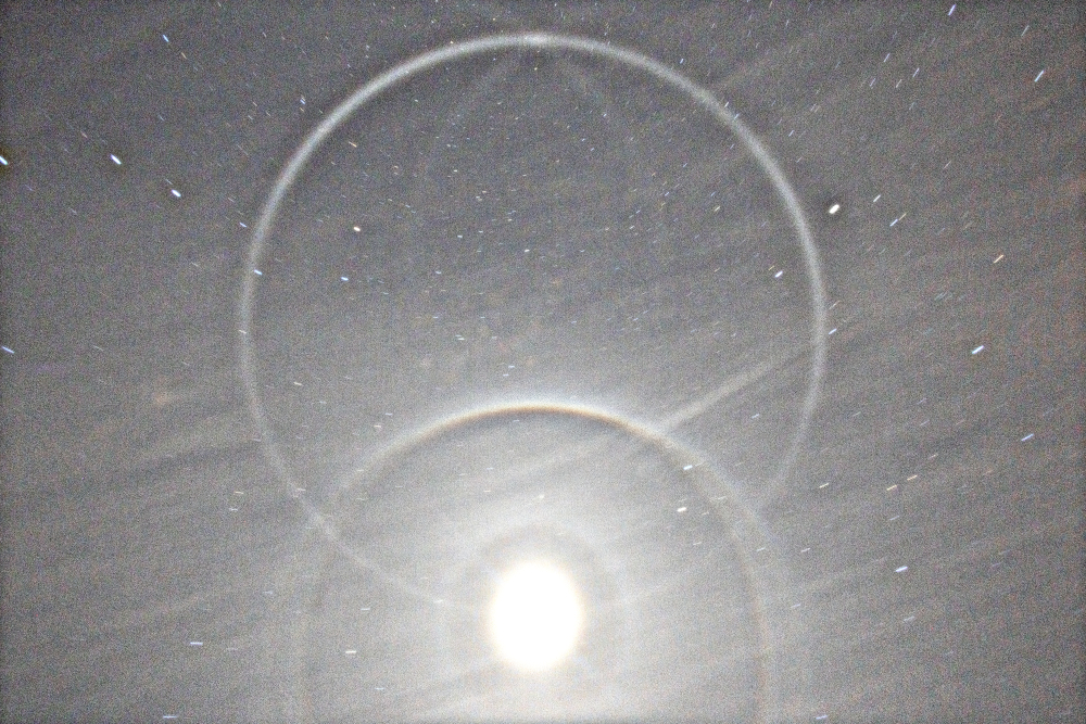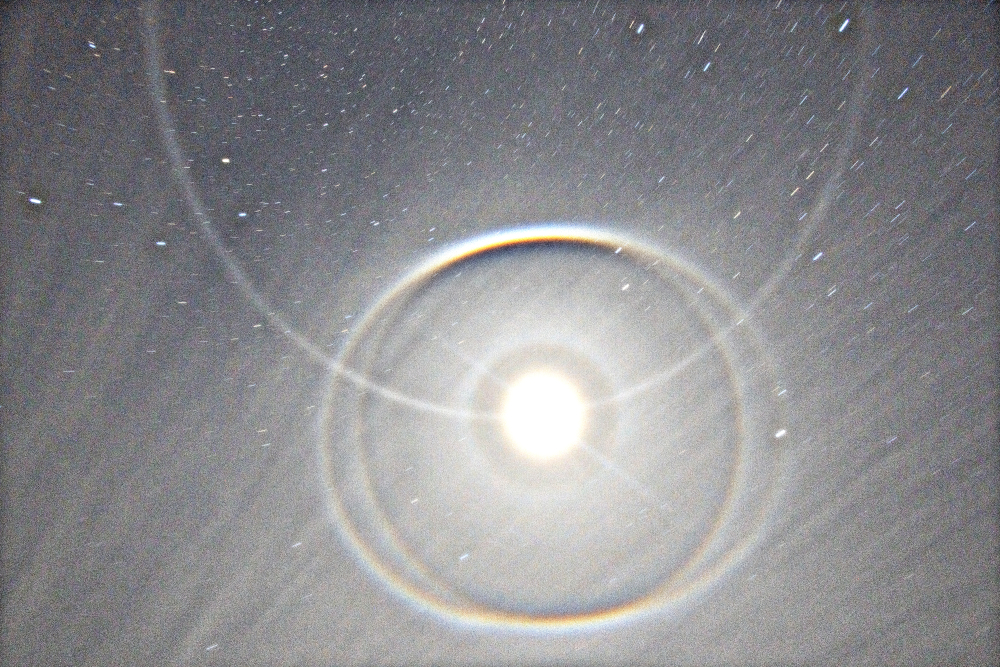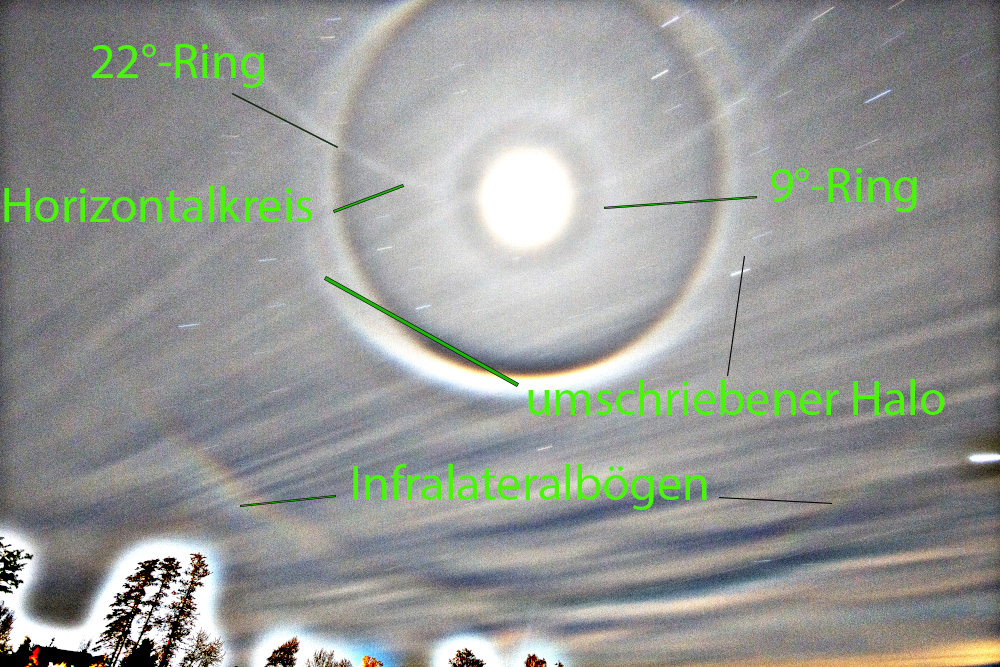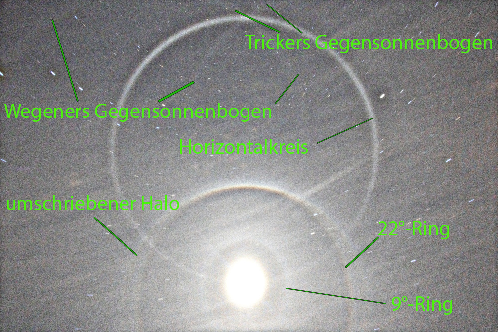 Die Sensation kam aber erst noch, als sich zwei sehr seltene Halos nachweisen ließen, welche ebenfalls durch Säulenkristalle entstehen: Wegeners und Trickers Gegensonnenbogen (wobei man hier eher von Gegenmondbogen sprechen müsste, da die Halos nicht an der Sonne, sondern am Mond auftraten). Diese beiden Halos sind extrem selten, da sie nur sehr schwach sind. Schwach deswegen, weil eine Vielzahl an Säulenkristallen vorhanden und die Wolkendecke auch noch sehr dünn sein muss. Beides war tatsächlich an diesem Abend gegeben (zumindest konnte daraus geschlossen werden, was die Anzahl der Kristalle betraf) und somit konnten tatsächlich diese beiden extrem seltenen Halos nachgewiesen werden: