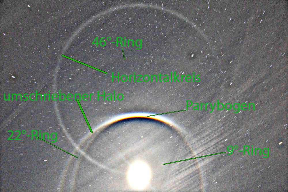 In den Fotos wurde festgestellt, dass keine Nebensonnen vorhanden waren, der Horizontalkreis muss also an Säulenkristallen entstanden sein. Dass Säulenkristalle an großer Zahl vorhanden waren, wurde dann klar, als der umschriebene Halo in den Fotos vollständig war: