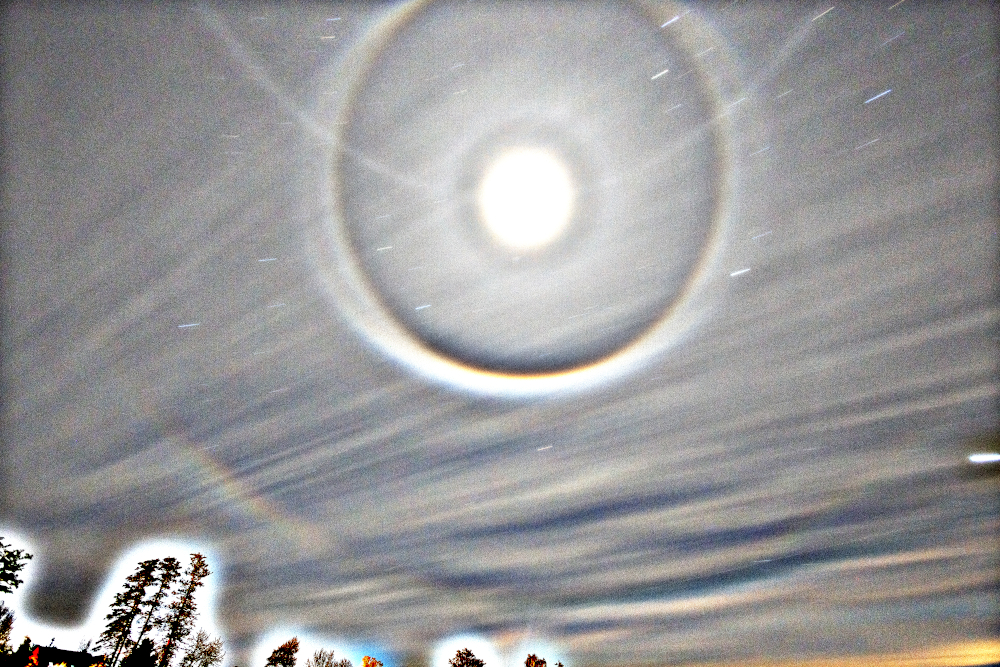 Erstaunlich war auch die Langlebigkeit des Phänomens, denn es konnte über zwei Stunden beobachtet werden, was schon sehr selten ist. Erst gegen Mitternacht schwächte es sich dann ab und es blieben der 9°- und 22°-Ring übrig, wobei auch noch Teile des umschriebenen Halos vorhanden waren. Alle anderen Halos waren nicht mehr nachweisbar.