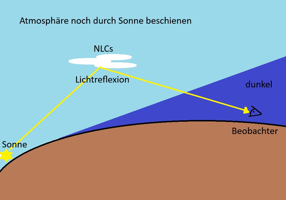 gestreut wird. Genau ab diesem Zeitpunkt werden die Leuchtenden Nachtwolken dann sichtbar, denn diese stehen dann auch noch im Sonnenlicht und reflektieren dieses. Es sieht somit so aus, als ob sie