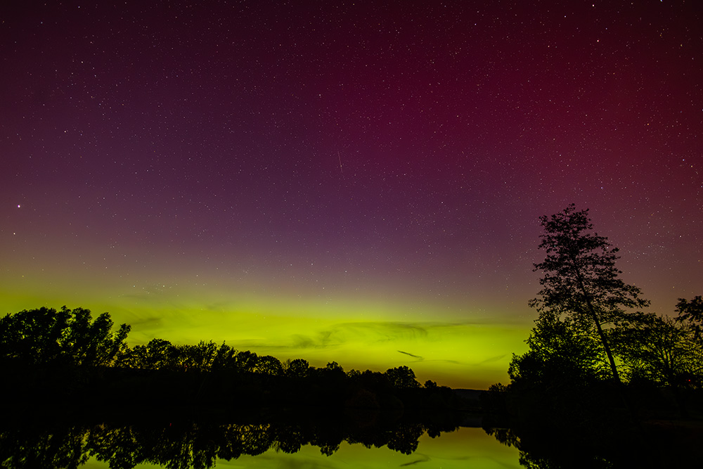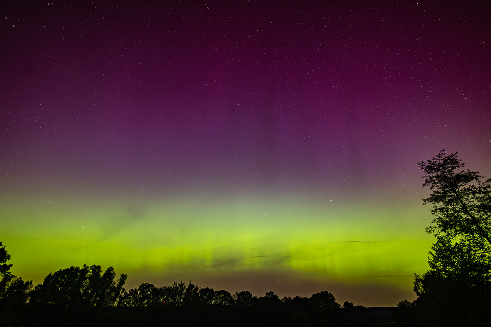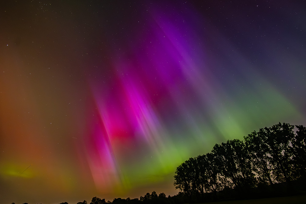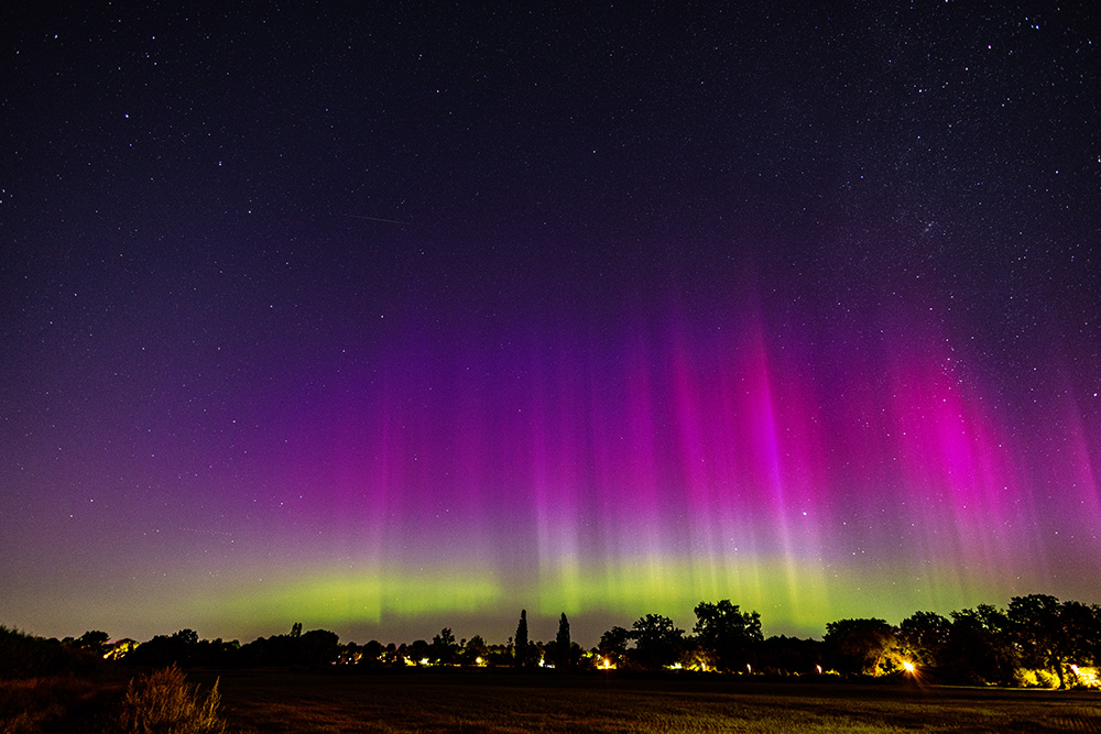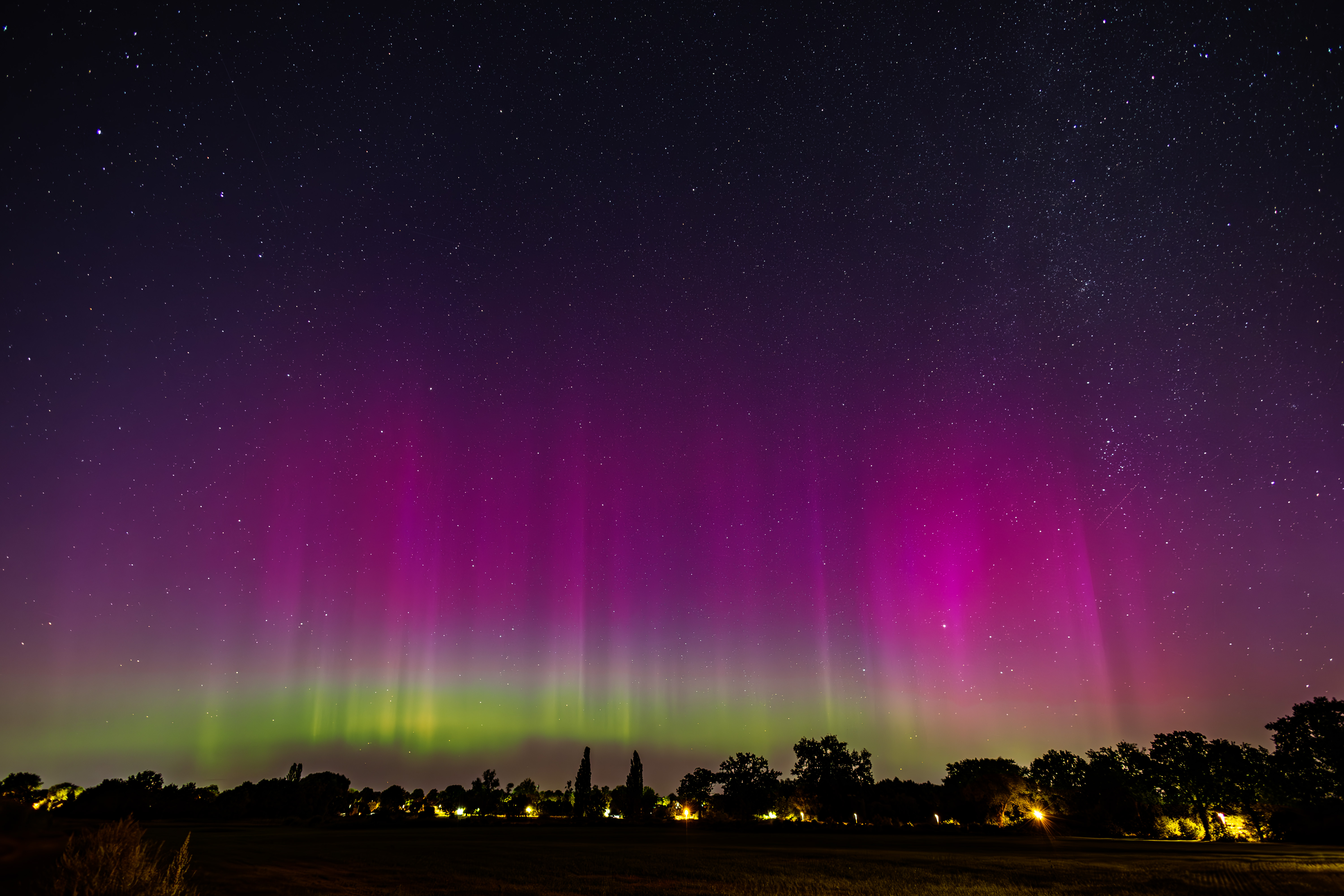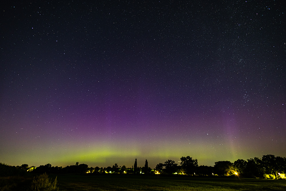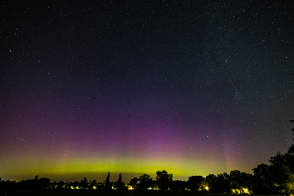 Beispiele von Polarlicht mit den typischen Farben. Links alle Farben in grün, rot, blau und violett, sowie Mischfarben in pink und orange in der Nacht zum 11.05.2024 und rechts die typische