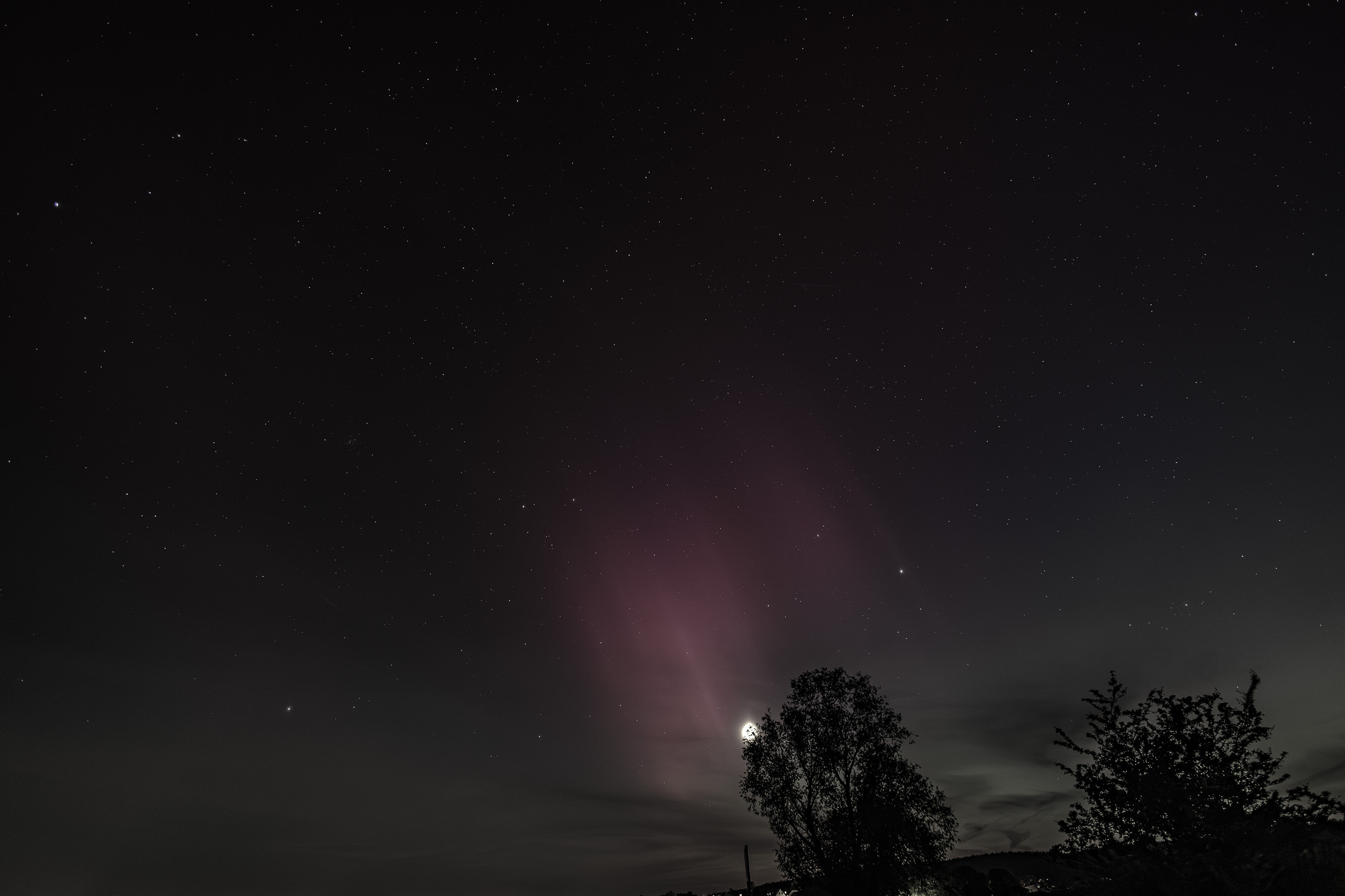 Doch das war noch nicht der Höhepunkt, denn in der astronomischen Dämmerung begann dann das erste Spektakel. Der Nordhimmel wurde selbst visuell jetzt rot. Auf der Kamera zeigte sich ein knalliges