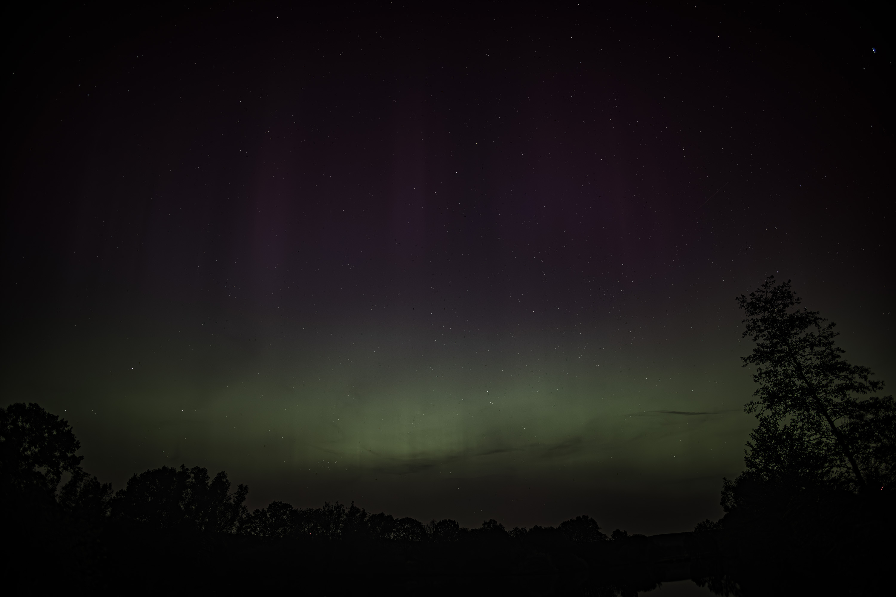 Das Polarlicht ging schließlich über den Zenit hinaus in den Südhimmel. Die Folge waren seltene Anblicke von Polarlicht. Einmal das Ganze nach Westen, wo kaum Bäume im Weg standen: