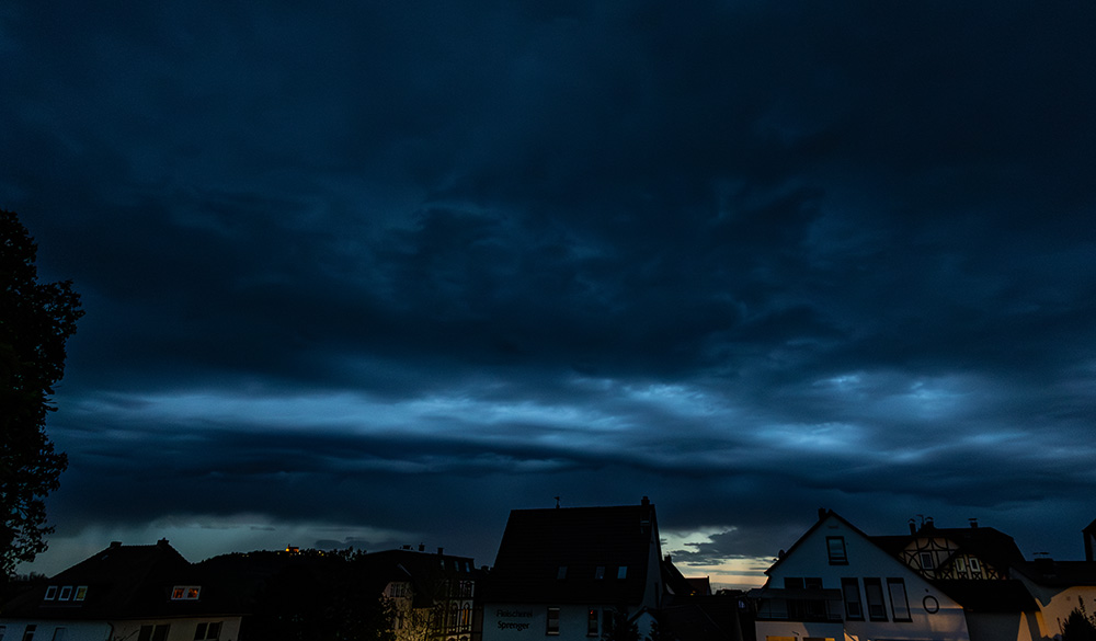 Tief "Fritz" verlagert sich heute zur Bretagne. Die teilokkludierte Kaltfront erreicht im Laufe des Tages Deutschland und sogrt in feuchter und zunehmend labiler Luft für Schauer und Gewitter. Wo genau die Schauer niedergehen und wie viel Niederschlag am Ende herunterkommt ist bei solch einer Lage wie immer Spekulation. Das Polarlicht von gestern Abend fand in der Nacht seine Fortsetzung (Bild 1), teilweise weiterhin deutlich visuell. Mehr Infos wieder im Polarlicht-Archiv. Die Temperatur sank unter dem weitestgehend klaren Himmel auf genau 3°C ab. Ansonsten verlief der Tag bis zum späten Nachmittag sonnig, die Temperatur stieg auf sehr warme 26,2°C an. Erst abends zogen vermehrt Wolken auf und es folgte die Front mit eigenartigen Wolkenstrukturen (Bild 2). Doch bis auf nicht messbaren Regen war nichts an der Front! Postfrontal klarte es am späten Abend wieder auf. |