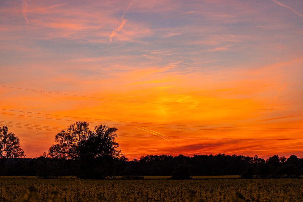 Hoch "Petra" verlagert den Schwerpunkt nach Südskandinavien und beeinflusst mit trockener Luft aus östlichen Richtungen das Wetter in großen Teilen Deutschlands. Die Nächte sind aufgrund der starken Abkühlung recht frisch, während es tagsüber dagegen wieder warm wird. In der überwiegend klaren Nacht kühlte es ordentlich ab auf minimal 3,7°C. Ansonsten verlief der Tag sonnig (Bild 1), einzelne flache und kleine Cumuli dienten nur zur Dekoration. Lediglich im Süden waren ein paar mehr hohe Wolkenfelder unterwegs, an denen es am Abend ein Abendrot gab (Bild 2). Die Temperatur stieg heute auf warme 21,7°C an. Abends wurde es schnell wieder frisch. |