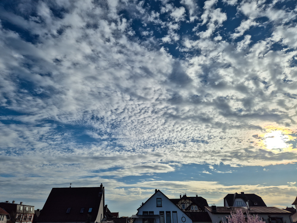Auch heute wieder viel Sonne, wenngleich mal etwas Cirrus, am Abend sogar lockere Felder Stratocumulus durchzogen (Bild). Ansonsten wurde es heute tagsüber warm. |