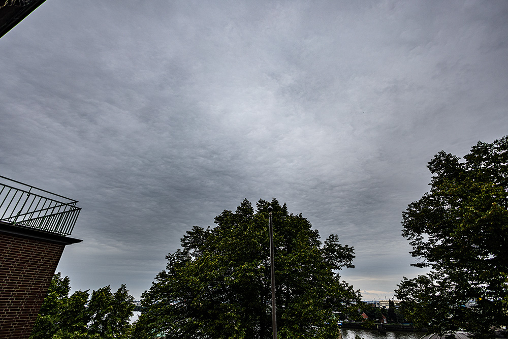 Die flache Tiefdruckrinne kommt weiter nach Deutschland voran. Die Luft ist zwar sehr energiereich (CAPE-Werte teilweise über 2000 J/kg!) und es gibt auch gewisse Konvergenzen im Bodendruckfeld, doch der Höhenrücken sorgt durch Absinken nach wie vor für einen sehr starken Deckel, sodass es zu keiner Auslöse von Konvektion kommt. Auf den Nordwesten Deutschlands greift im Laufe des Tages eine kaum aktive Kaltfront über. Dort kann vielleicht dann doch etwas ausgelöst werden, wenn dann aber nur sehr lokal. Ansonsten bleibt es heiß und teils sehr schwül. Heute sonnig, wenn nicht sogar wolkenlos. Erst am Abend zeigte sich mal etwas Cirrocumulus (Bild), welcher sich teils in Altocumulus umwandelte. Nach sehr lauen 18°C am Morgen stieg die Temperatur wieder rasant an und erreichte sehr heiße 37,7°C, womit der nächste Wüstentag erreicht wurde. Bei Taupunkten teils um oder gar über 20°C war es drückend schwül. Am Abend blieb es lange sehr warm. |
