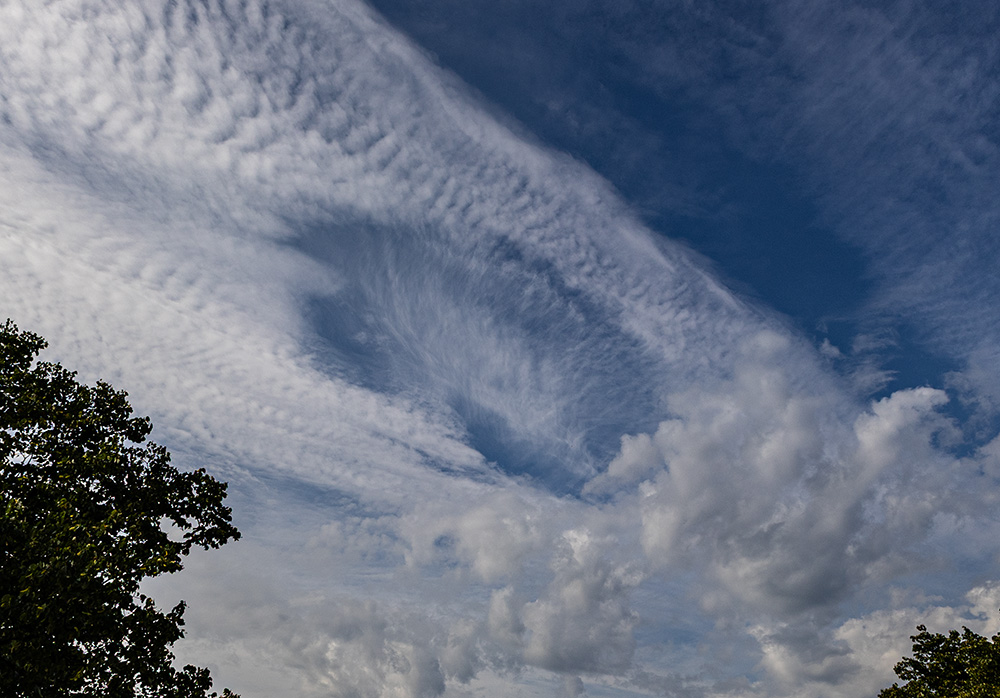 Undulatus (Bild 2) und eine Hole-Punch-Cloud (Bild 3) interessant. Das Wolkenfeld gehörte nicht zur Kaltfront, sondern lag im polaren Jetstream, welcher über Norddeutschland