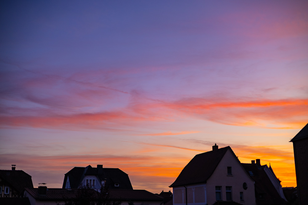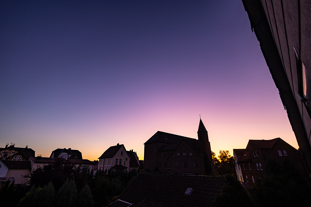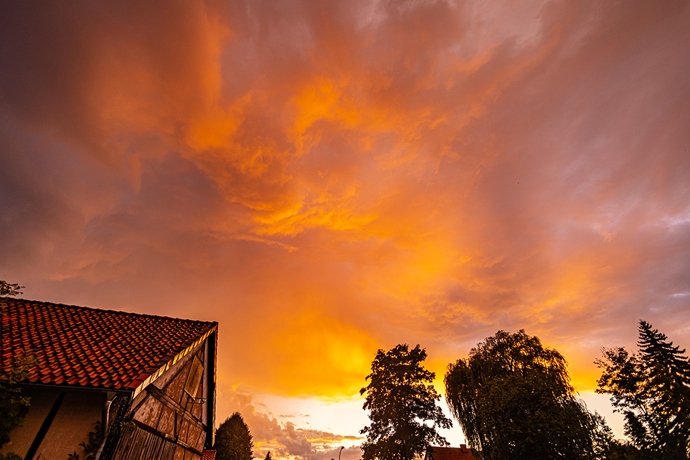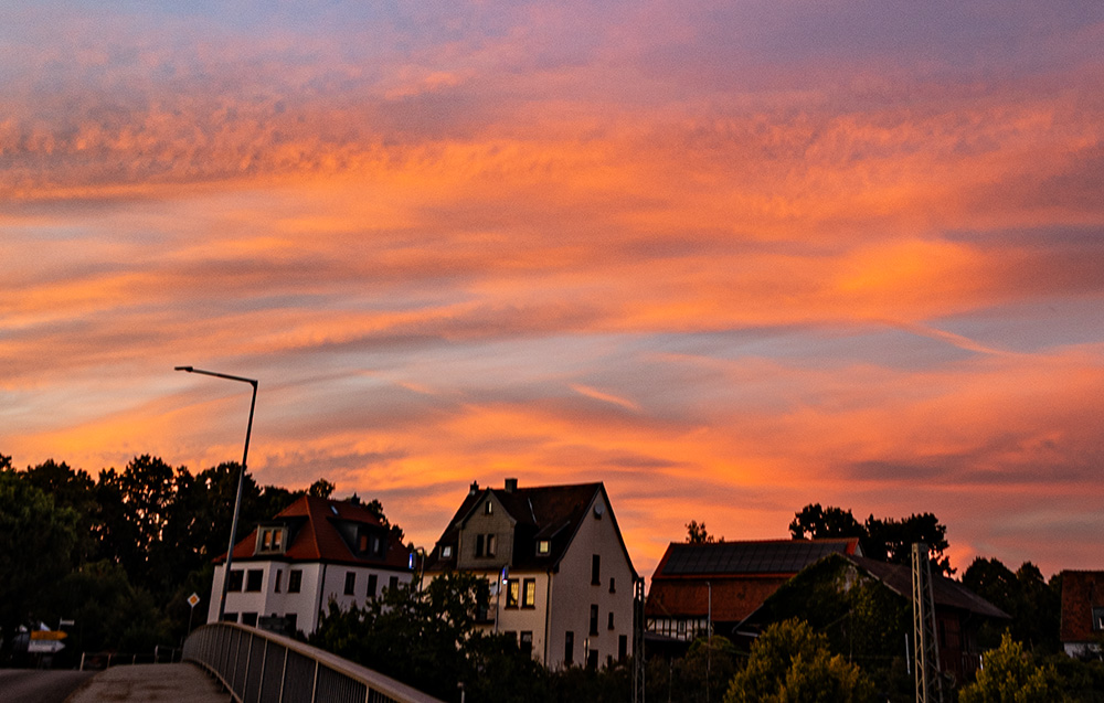 Das wellende Frontensystem, an welchem sich das neue Tief "Thomas" gebildet hat, verlässt allmählich Deutschland, sodass die große Schwüle erst einmal Geschichte ist. Im Westen sorgt im Laufe des Tages ein Bodentrog für ein paar Schauer, sonst schiebt sich ein flacher Keil mit Absinken herein. Lau war es in der Nacht, am Morgen minimal 15,1°C. In der von gestern durch das Gewitter stark angefeuchteten Luft bildete sich rasch Stratus. Dieser wurde am Morgen durch mehrschichtige Bewölkung abgelöst, aus welcher auch 1,2 mm Regen fielen. Am Vormittag dann trocken und Übergang zu einem Wechsel aus Sonne und Cumulus. Am Abend wurde es dann sogar nochmals richtig freundlich (Bild), ehe die letzten Reste des oben genannten Bodentroges mit Bewölkung eintrafen. Die Temperatur stieg heute auf maximal 25,4°C, womit ein Sommertag erreicht wurde. Am Abend blieb es noch länger warm. |
