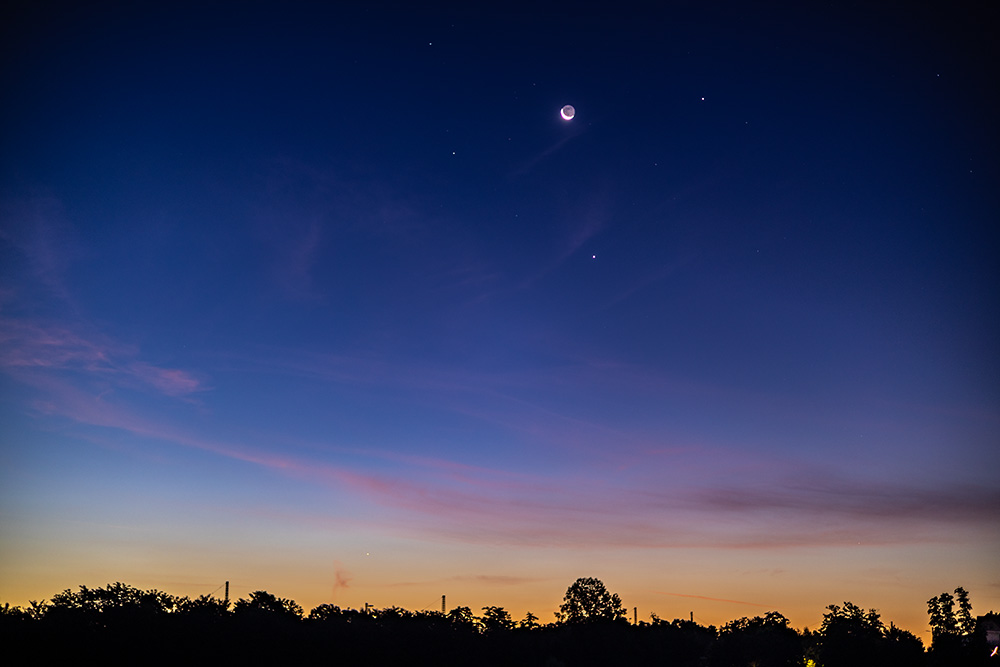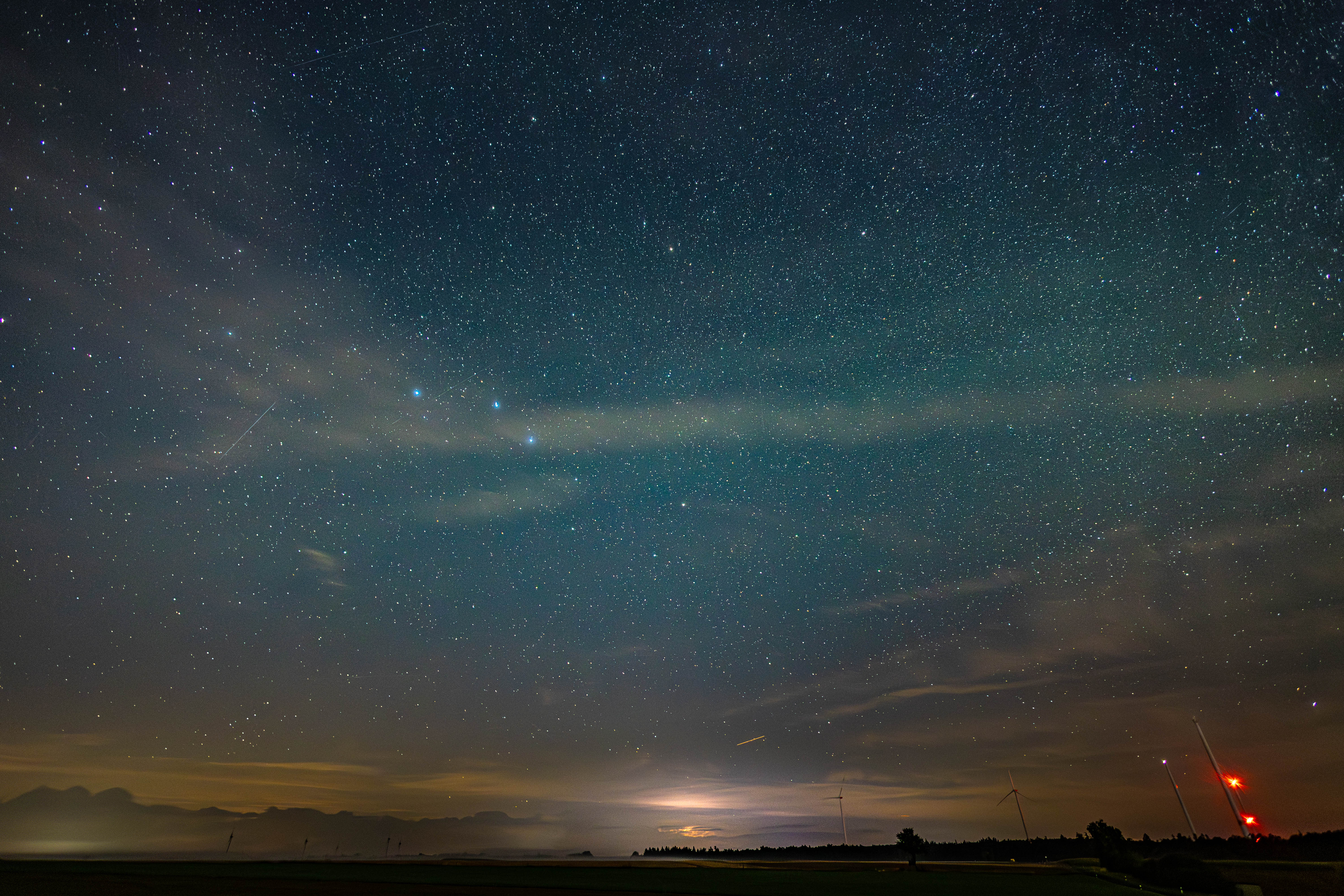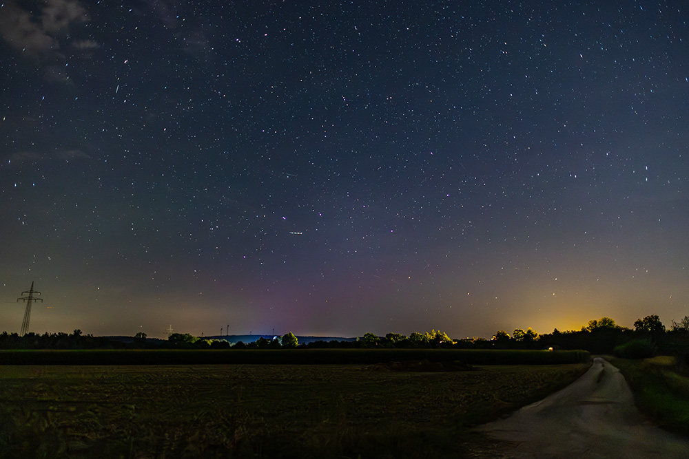 Die gestrige Kaltfront löst sich auf, es fließt aber trotzdem kühlere Luft nach Deutschland ein. Im Süden sorgt derweil die südeuropäische Tiefdruckrinne für ordentlich Regen. Eigentlich müsste es hier am Standort auch mal richtig regnen, der August ist bisher erheblich zu trocken. In der Nacht gering bewölkt, es kühlte bis auf 12,7°C ab. In der Früh gab es leichtes fotografisches Polarlicht (Bild 1) und es konnte die Konjunktion von Mond, Venus und Jupiter, sowie später Merkur beobachtet werden (Bild 2). Ansonsten war es heute sonnig, nur wenige flache Quellwolken gab es. Mit maximal 28,9°C wurde es sehr warm. |