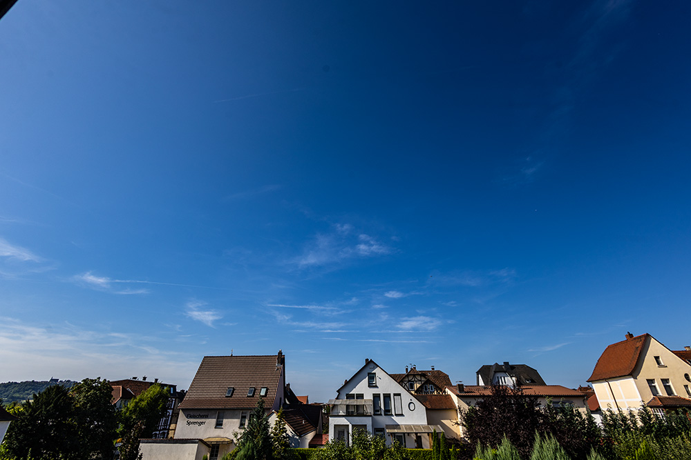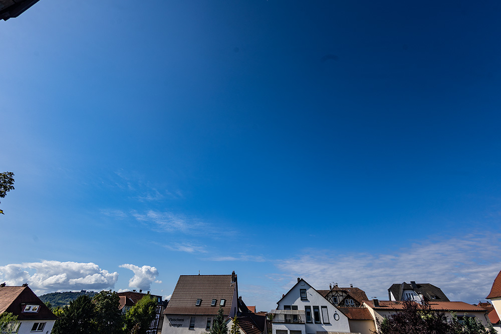 Der Höhentrog wandert nach Osten ab, womit Hoch "Mareike" etwas näher rücken kann. Der Schwerpunkt liegt bis zum Nachmittag über den Niederlanden. Mit nördlicher Strömung wird eine kühle und recht feuchte Luftmasse herangeführt, welche aber zunehmend abtrocknet und sich erwärmt. Die Nacht verlief klar, sodass es gut abkühlen konnte. Am Morgen wurden 6,4°C gemessen. Ansonsten startete der Tag mit viel Sonne und nur wenigen Wolken (Bild). Im Tagesverlauf bildeten sich dann vermehrt Cumuli, welche an einer Absinkinversion breit liefen und sich in Stratocumulus umwandelten. Am Abend klarte es dann wieder auf. Die Temperatur erreichte einen Höchstwert von warmen 24,1°C, ehe es am Abend schnell wieder kühl wurde. |
