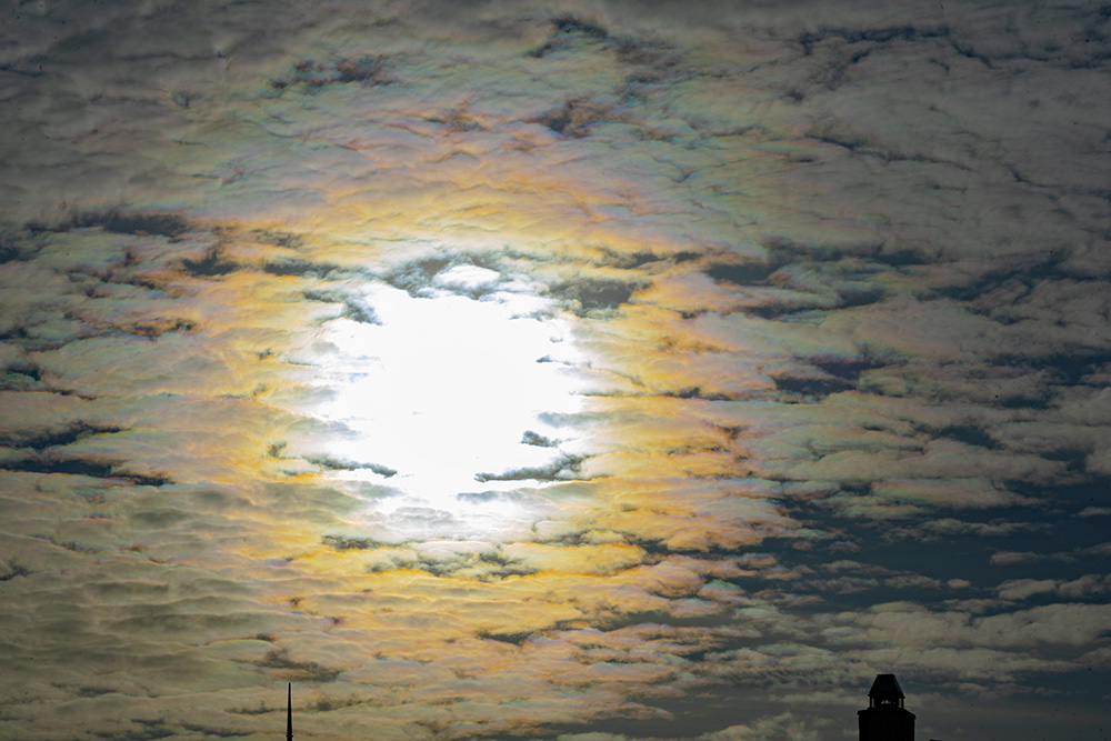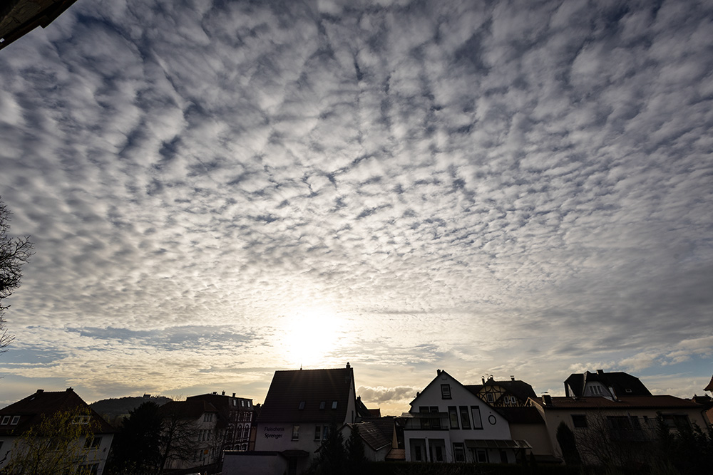 Der gestrige Höhentrog tropft heute ab und verlagert sich weiter nach Osten. Dadurch kann sich heute Zwischenhocheinfluss durchsetzen. Doch bereits am Abend greift das nächste Frontensystem auf Deutschland über. Am Morgen und Vormittag gab es noch in der restlichen Höhenkälte von gestern Graupelschauer, welche 0,3 mm hinterließen. Danach lockerte es verstärkt auf und die Sonne schien sogar mal länger. Dazu blieb es trocken. Am Mittag zeigten sich mal irisierende Wolken (Bild), hauptsächlich Cirrocumulus. Nachmittags zog es sich mit Altostratus zu, ehe es abends wieder bei Stratocumulus mal gelegentlich auflockerte. Die Temperatur stieg auf maximal 7,1°C an. Der Tiefstwert von 1,7°C wurde erst am Abend erreicht. |