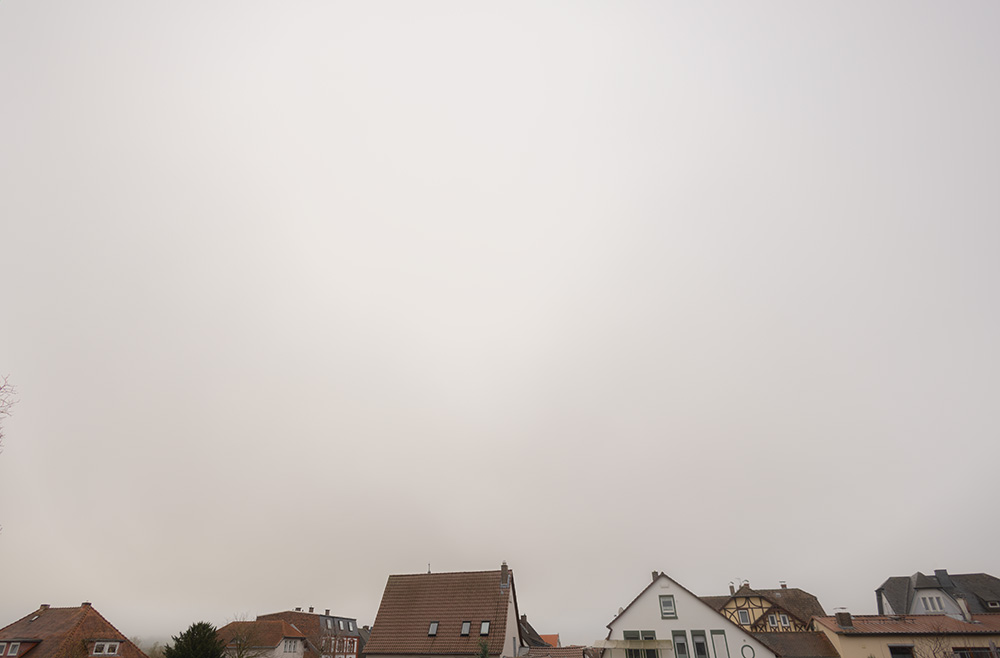 Das Höhenhoch schwächt sich allmählich ab und macht Platz für einen Trog, welcher sich in Richtung Skandiavien und Britische Inseln ausdehnt. Damit wird Hoch "Ernst" nach Osten ins östliche Mitteleuropa abgedrängt. Signifikante Änderungen beim Wetter hat das heute noch nicht. Wie zuletzt auch ganztags trüb durch Stratus, wobei es teils so aussah, als ob doch irgendwelche Lücken vorhanden waren, wo der Himmel leicht durchschien (Bild). Dazu aber weiterhin kaum Temperaturbewegung mit Werten zwischen -0,6°C und 0,8°C. |