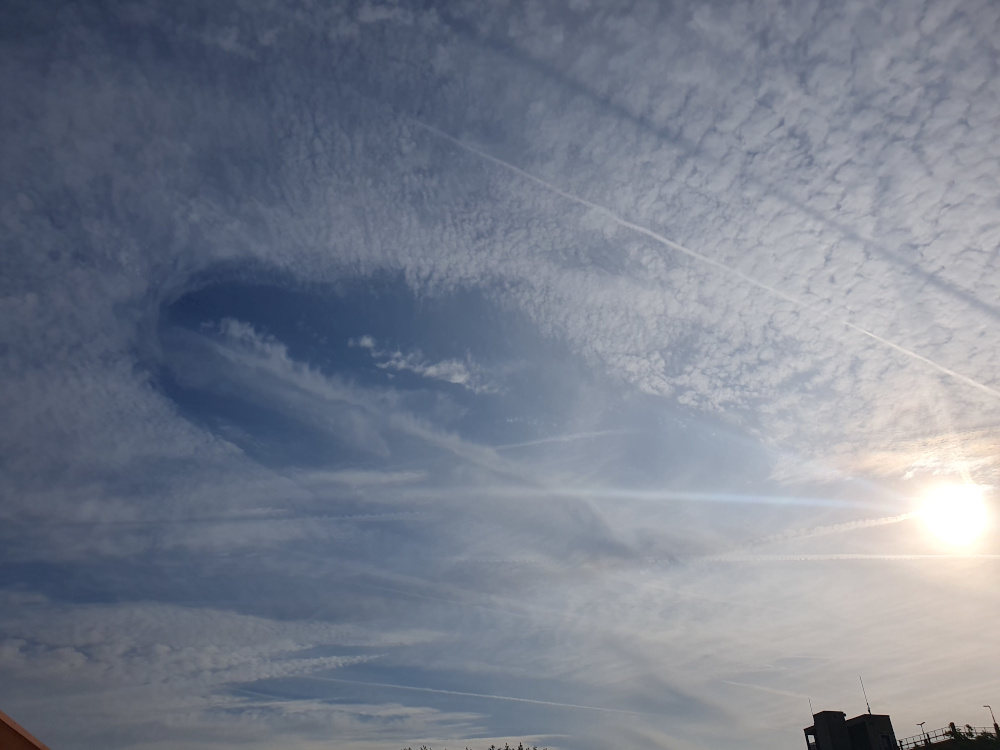 Noch immer herrscht hoher Luftdruck unter Hoch "Frederik" vor. Mittlerweile fließt mit südlicher Strömung eine heiße Luftmasse ein. Heute dann kaum noch Quellwolken. Am Morgen zogen ein paar hohe Wolkenfelder durch, dabei konnte eine Hole-Punch-Cloud gesichtet werden (Bild 1). Ansonsten tagsüber ein paar wenige Cirren, am Abend trat ein etwas kräftigerer Zirkumzenitalbogen auf (Bild 2). Nach 14,2°C am Morgen wurde es heute einen Tick heißer mit maximal 31,8°C. |