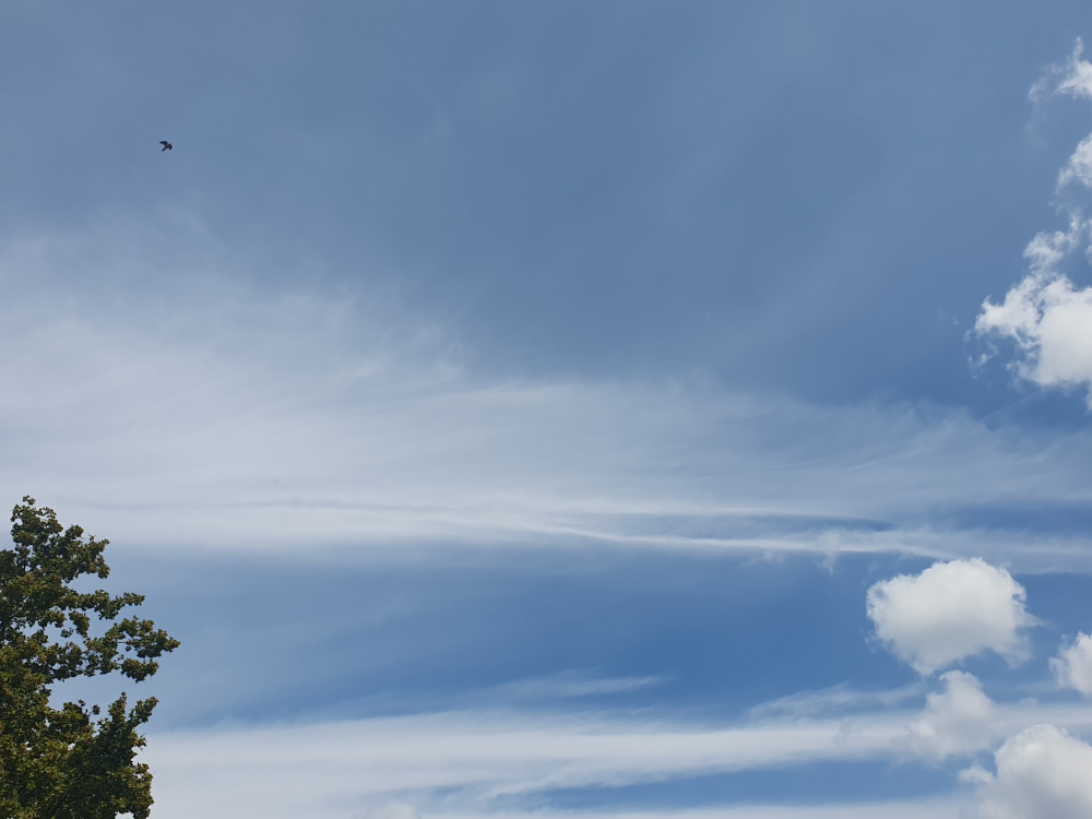 Unter Hochdruckeinfluss heute erneut sehr viel Sonne, es zog lediglich ein wenig Cirrus durch (Bild). Dazu sehr warm. |