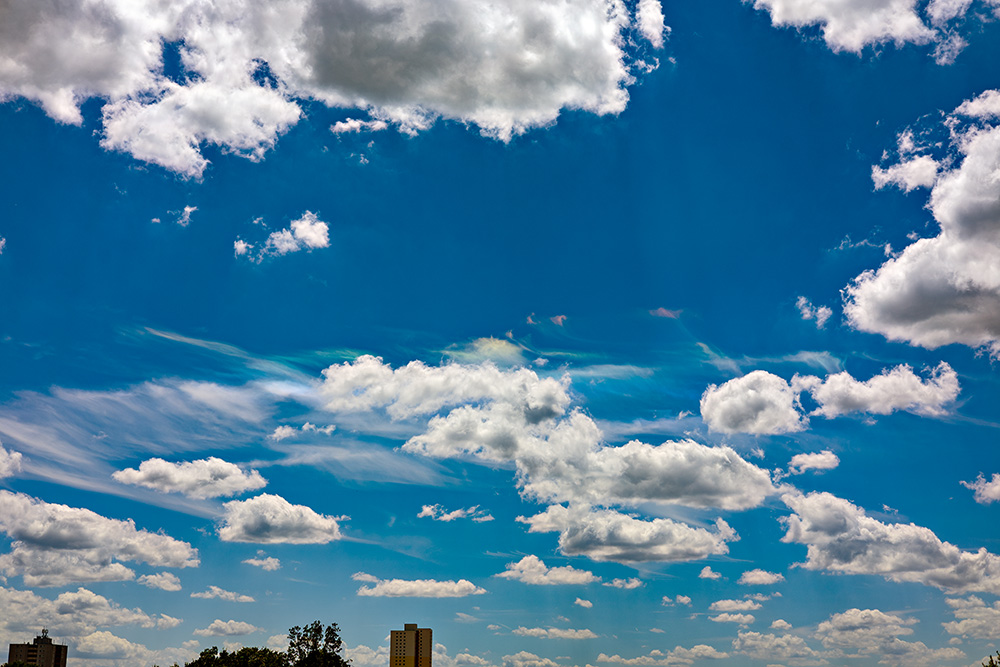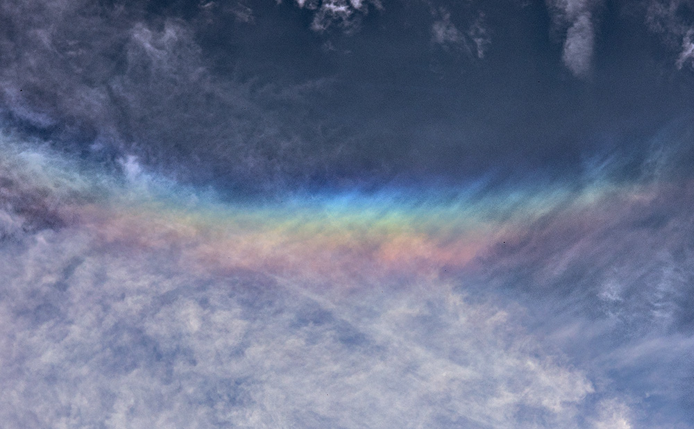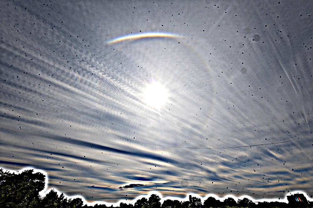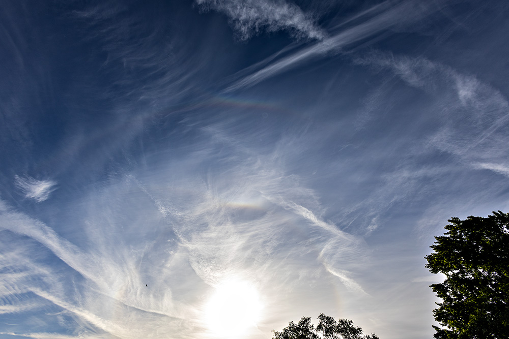 Auch heute hält noch der Hochdruckeinfluss an, Hoch "Dominik" ist dabei wetterbestimmend. Ab morgen nimmt dann aber bereits von Westen her der tiefe Luftdruck wieder zu. Mit südwestlichen Winden wird dabei eine sehr warme bis heiße Luftmasse herangeführt. Heute meist wieder sonnig. Lediglich ein wenig Cirrus zog mal über dem Himmel und ab mittags gab es dann ein paar Quellwolken. Nachmittags konnte im Cirrus dann ein auffälliger Zirkumhorizontalbogen gesichtet werden, überwiegend in blau und grün (Bild). Dazu wurde es sehr warm. |
