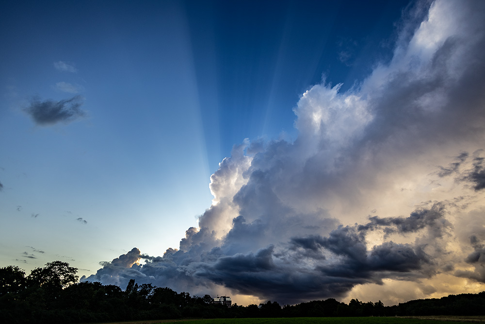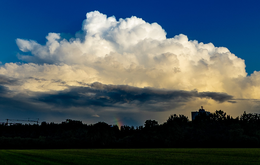 Hoch "Frederik" hat sich nach Osteuropa verlagert und macht Platz für atlantische Tiefdrucksysteme. Tief "Heike" über dem Ärmelkanal verlagert sich langsam in Richtung Skandinavien. Die Kaltfront erreicht am Abend den Westen, doch vorgelagert ist eine Konvergenz, wo sich dann das eigentliche Wettergeschehen abspielen wird. Der Tag begann noch recht freundlich, doch im Westen türmten sich bereits riesige Wolkengebirge auf (Bild 1). Doch bis zum Abend passierte erst einmal nichts. Die Temperatur stieg von sehr lauen 18,3°C auf 29,7°C, womit nur sehr knapp kein weiterer Hitzetag erreicht wurde. Abends kam es dann aber doch zur Auslöse und es ging ein Platzregenschauer nieder, welcher 8,6 mm brachte. Rückseitig des Schauers dann ein Fragment eines doppelten Regenbogens (Bild 2). Es war unangenehm schwül heute. |
