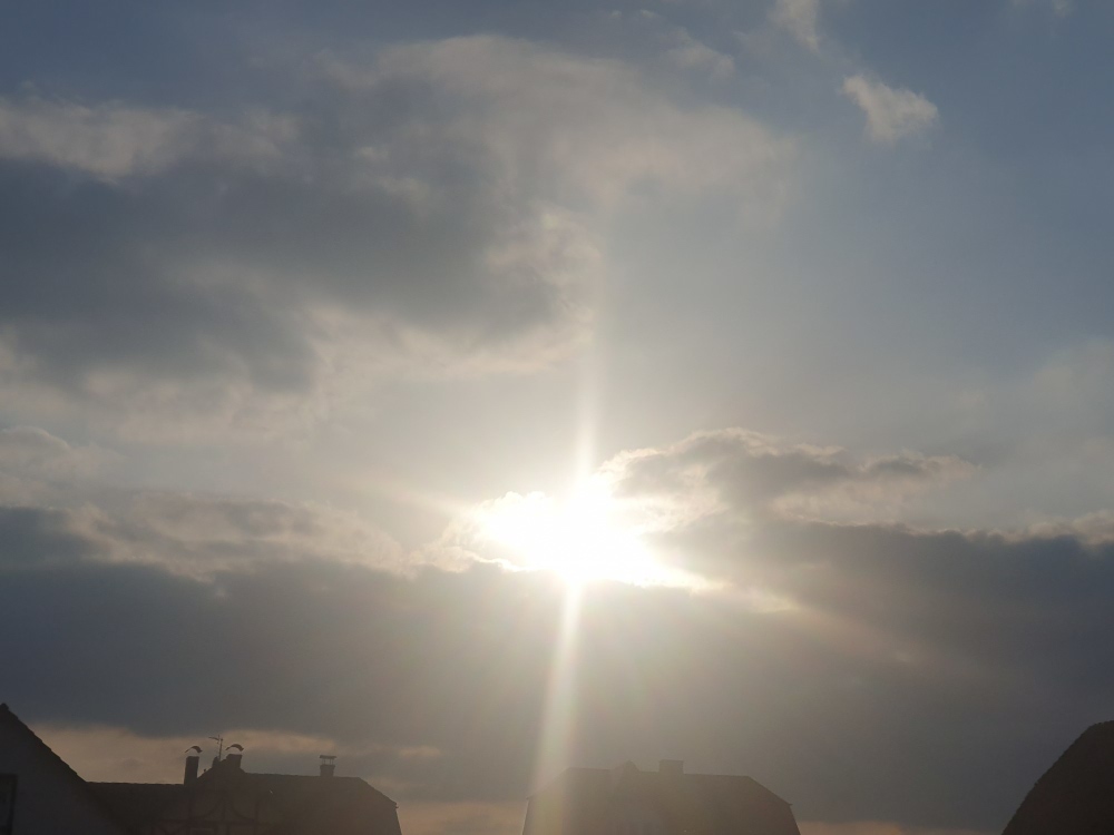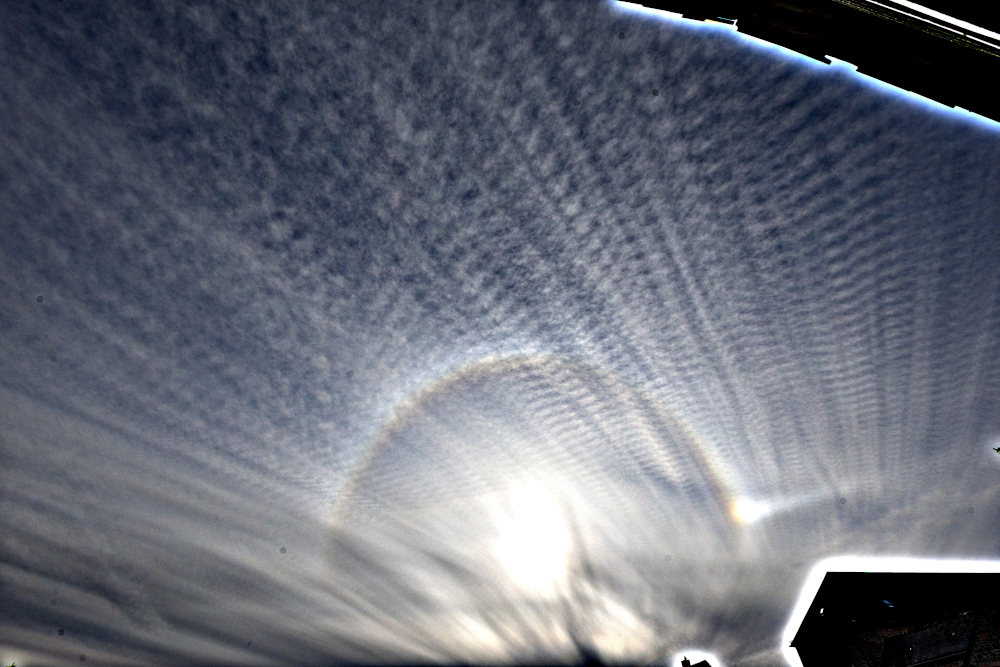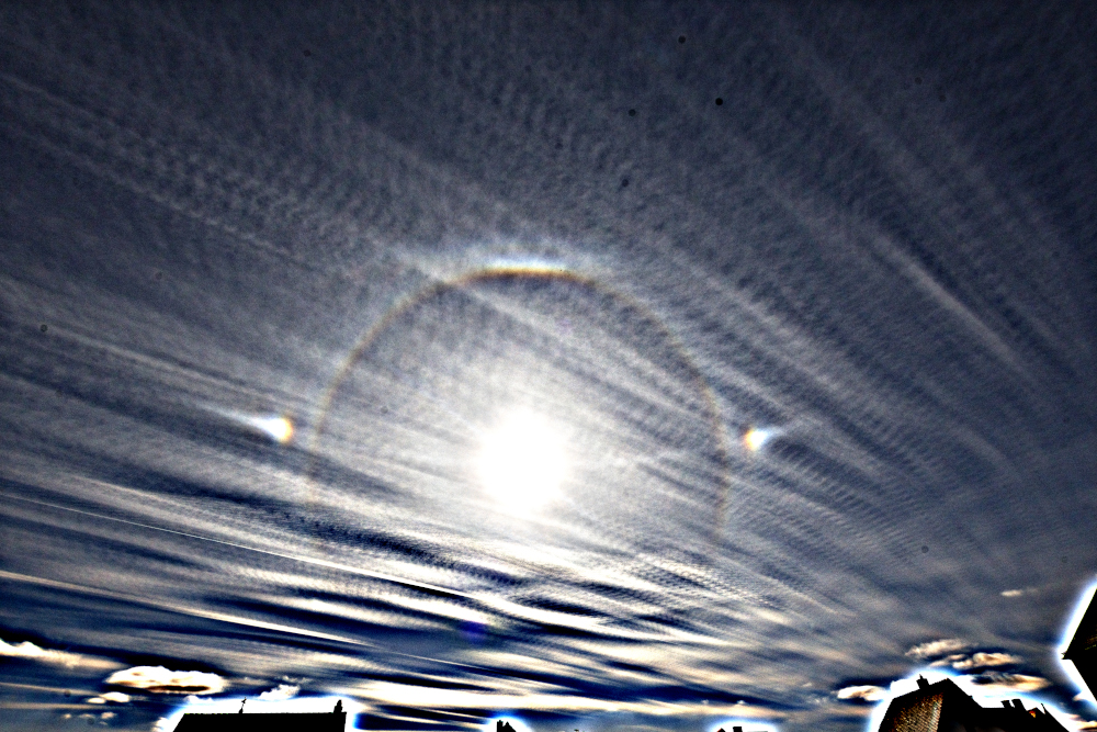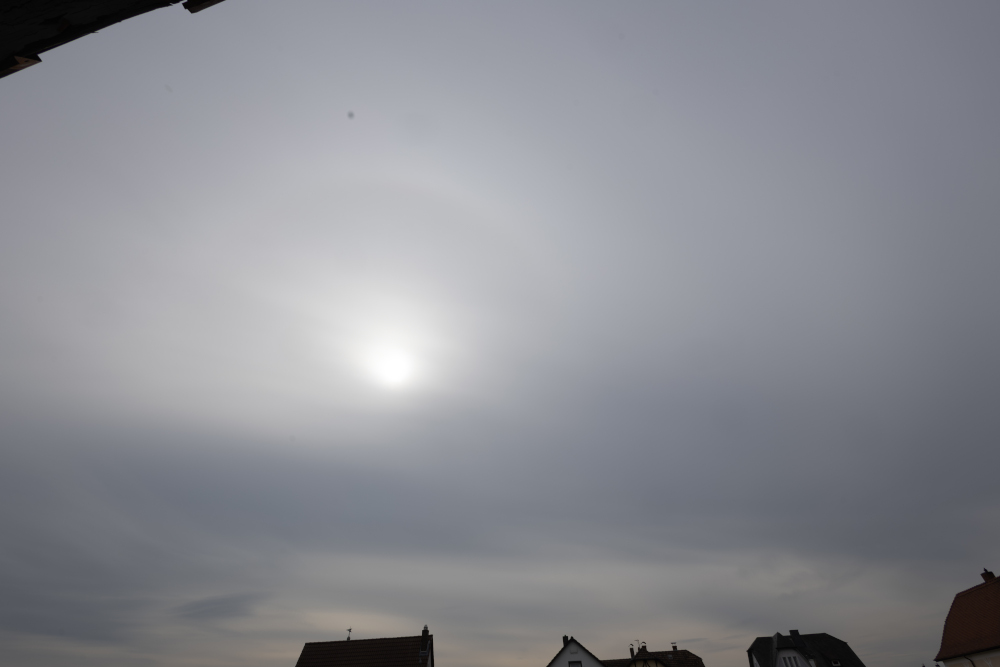 Eine schwache Wetterfront zieht heute über Deutschland hinweg, sie hat aber kaum Einfluss und schwächt sich schon merklich ab. Über Westeuropa liegt noch immer ein Trog, welcher bis zur Iberischen Halbinsel und nach Italien austrogt. Und der März begann, wie der Februar endete: mit Halos (Bild), überwiegend Nebensonnen, aber auch der 22er und ZZB waren dabei. Ansonsten war es heute bewölkt, aber die Sonne schien auch oft. Tmax heute etwas über 11°C, passabel für Anfang März. Am Morgen gab es leichten Luftfrost bei -0,5°C. |