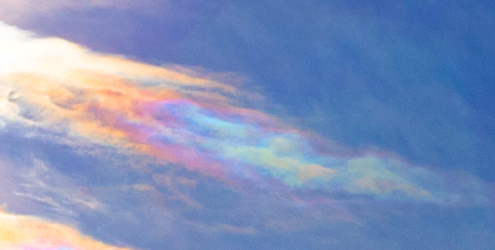 Der schwache Tiefausläufer zieht nach Ostdeutschland und löst sich zunehmend auf. Es setzt sich heute leichter Hochdruckeinfluss durch, obwohl der Barometerstand das Gegenteil anzeigt. Großwetterlage Sz, ein Trog liegt über Westeuropa und reicht bis Südeuropa. Dadurch ergeben sich interessanten Temperaturen: über Mitteleuropa ist es mit der Südanströmung deutlich wärmer als über der Iberischen Halbinsel und Italien. Und heute drehte der Frühling schon richtig auf: nach 0,5°C am Morgen ohne Frost stieg die Temperatur bis zum Nachmittag auf fast schon warme 16,3°C an. Dazu schien meist die Sonne, es zogen aber auch einzelne hohe Eiswolken durch in Form von Cirrus und seltenen Cirrocumulus Lenticularis. Letzterer irisierte teils sehr stark (Bilder 1 und 2). Auch ein Kranz konnte aufgenommen werden (Bild 3). Abends kühlte es schnell wieder ab. |