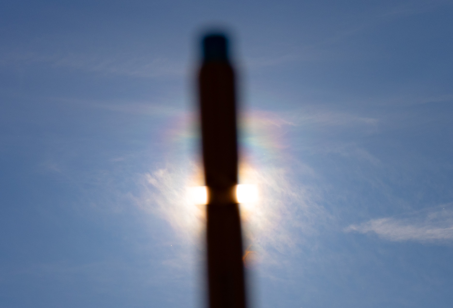 Der hohe Luftdruck und die südwestliche Anströmung der Luftmassen hält unter Hoch "Markus" an. Das Hoch selbst verlagert seinen Schwerpunkt weit nach Osteuropa, sodass ab morgen von Westen wieder Tiefausläufer auf Deutschland übergreifen können. Kaum Wetteränderung: bei überwiegend sonnigem Wetter zog noch immer Cirrus und Cirrostratus durch, sodass die Haloaktivität weiter anhielt. Am späten Nachmittag gab es an der Sonne wieder ein interessantes Halophänomen (Bild). Die Temperatur stieg von 4,8°C auf warme 19,1°C an. Abends kühlte es abermals schnell ab. |