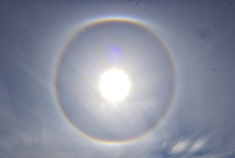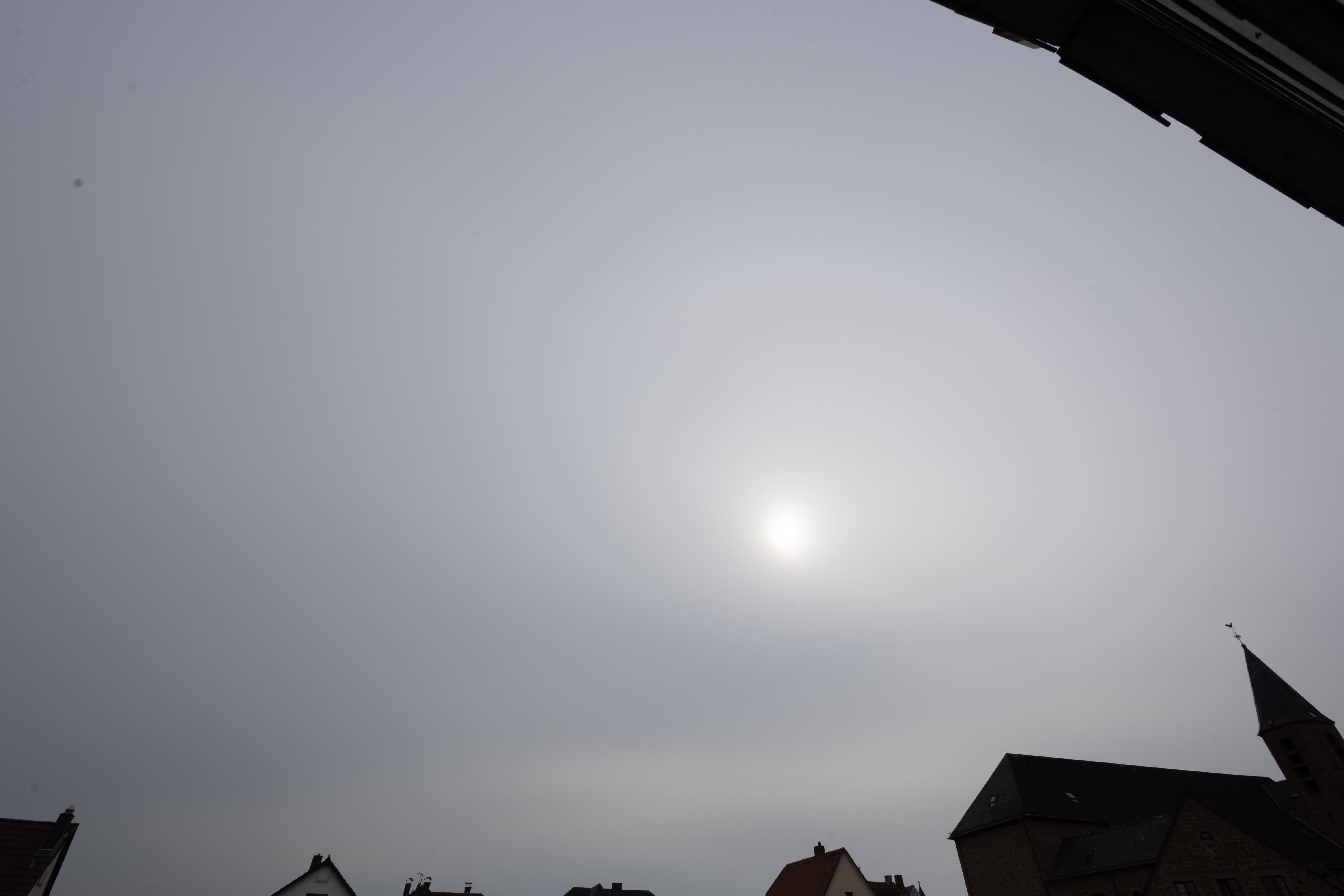 Heute mal kurzer Zwischenhocheinfluss, doch Tief "Gulla" folgt bereits aus Westen. Doch damit nicht genug, ein weiteres Tief folgt und soll wohl einiges an Niederschlag bringen. Mal sehen, was daraus die nächsten Tage wird. Recht freundlich heute mit einiges an Sonne, wenngleich es am Mittag mal ein Schauer gab, welcher die heutige Tagesmenge von 0,3mm brachte. Oft gab es ein Gemisch aus Sonne und flachen Cumulus, bzw. Stratocumulus. Am Nachmittag dann Aufzug von Cirrostratus, es trat der 22°-Ring auf (Bild). Der Cirrostratus verdichtete sich dann am Abend zu Altostratus. Der nächste Regen wurde angekündigt. Tmax heute durchaus angenehme 19,3 °C, Tiefstwert bei 7,3 °C. |