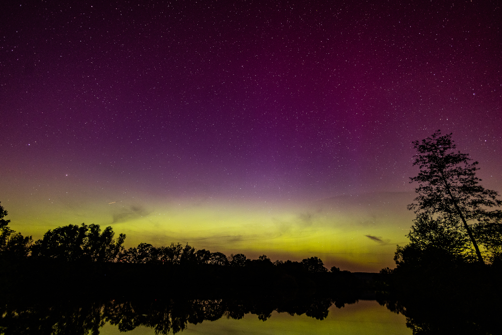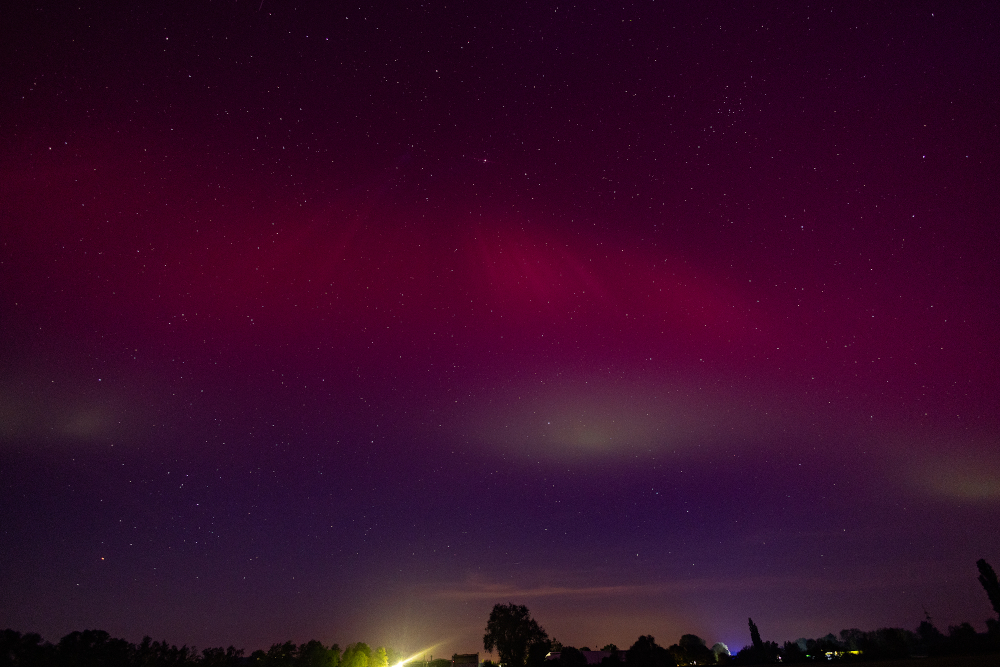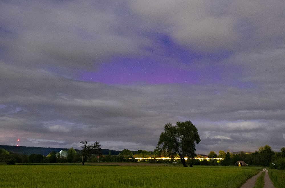 Überwiegend tiefer Luftdruck bestimmt das Wetter, im Südwesten sogar mit ernorm hohen Niederschlagsmengen. Auch hier wurden hohe Mengen berechnet, ja "wurden", mehr dazu unten. Das Tiefdruckwetter geht die nächsten Tage über das Pfingstwochenende weiter. Tja, nichts ist daraus geworden aus den hohen Regenmengen, es blieb heute komplett trocken. Doch Sonne war auch Fehlanzeige, typisches "Dümpelwetter", sehr nervig. Abends gab es ein paar Auflockerungen und genau da wieder ein Polarlicht (Bild). Der Mai wird definitiv ein "Polarlicht-Monat" werden. Die Temperatur war aufgrund der dichten Wolken verhalten und stieg auf maximal 18,7 °C an, was aber durchaus als angenhem empfunden wurde. |