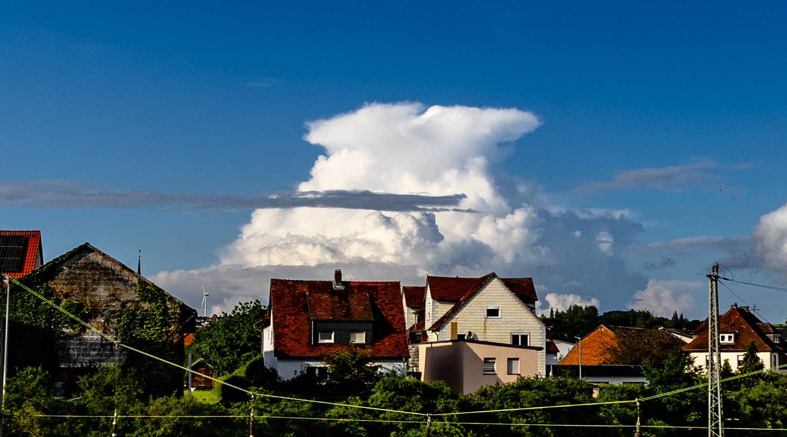 Tief "Maxine" zieht nach Nordwesten(!) ab, ungewöhnlich. Deutschland verbleibt dabei im wettertechnischen Niemandsland. Der tiefe Luftdruck konzentriert sich auf dem Ostatlantik, doch Hochs liegen nur über Skandinavien und Russland. Nach wie vor sind über Deutschland durchaus heftige Schauer und Gewitter möglich. Und heute dann wieder trocken, wobei es in der Umgebung durchaus Schauer gab. Der Tag begann noch meist bewölkt, die Sonne konnte sich dann aber doch noch durchsetzten. Es bildeten sich dann aber wieder mächtige Quellwolken (Bild 1). Die Temperatur stieg von morgendlichen 12 °C auf maximal 22,6 °C an. Schön warm. Am Abend an einen fernen Schauer im Nordosten ein Regenbogenfragment (Bild 2), durchaus hell. |