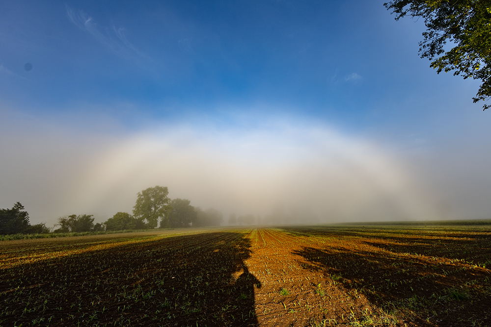 Doch mal leichter Zwischenhocheinfluss, sodass das Wetter sich heute von seiner ruhigen Seite zeigt. Doch das nächste Tief ist bereits im Anmarsch. Wieder stehen teils große Regenmengen an, will der Mai ein deutlich zu nasser Monat werden? Wie oben beschrieben sehr schönes Wetter heute. Der Tag begann mit Nebel, in diesem sehr schöne Schattenstrahlen (Bild 1) und teils intensive Nebelbögen (Bild 2), klasse! Der Nebel löste sich noch am Morgen auf, sodass der Vormittag sonnig verlief. Erst anschließend bildeten sich flache Quellwolken, die den freundlichen Eindruck aber kaum störten. Nach 8,7 °C am Morgen wurde es heute mit maximal 24,7 °C warm. |