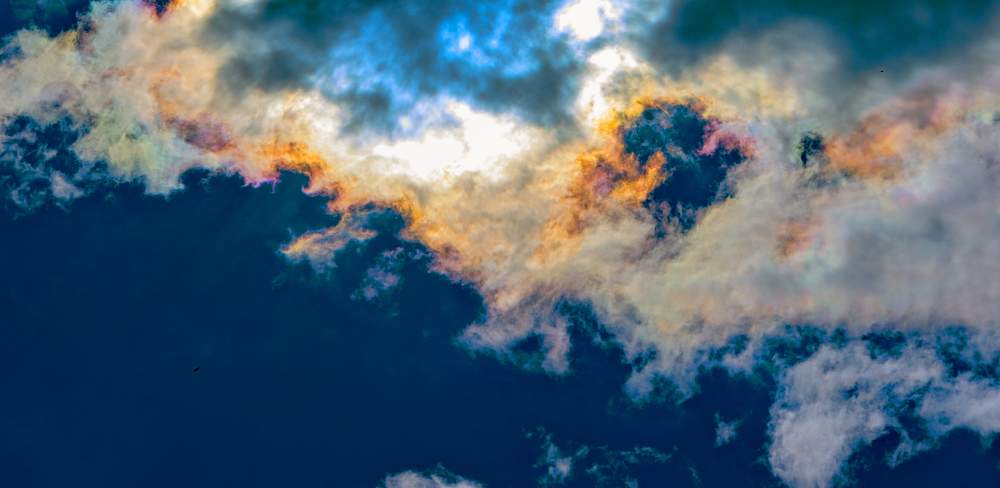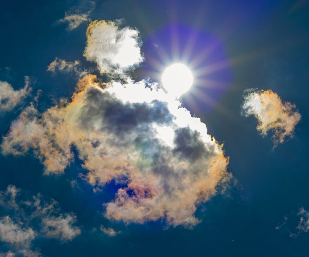 Hoch "Thomas" rückt näher an Deutschland heran, sodass die feuchte Nordseeluft lediglich im Norden Deutschlands für teils trübe Stimmung sorgt. Weiter im Süden bilden sich lediglich am Nachmittag mal ein paar Quellwolken aus. Dazu wird es deutlich wärmer, teils sogar sommerlich. Und heute mit maximal 25 °C ein Sommertag. Sowohl morgens, als auch abends, ist es sonnig. Nachmittags dann die typischen aufsteigenden Warmluftblasen in Form von flachen Quellwolken. Diese irisierten teilweise in schönen Farben (Bild 1 und 2). Abends Durchzug von etwas Cirrus, es trat eine gleißend helle rechte Nebensonne auf (Bild 3). |