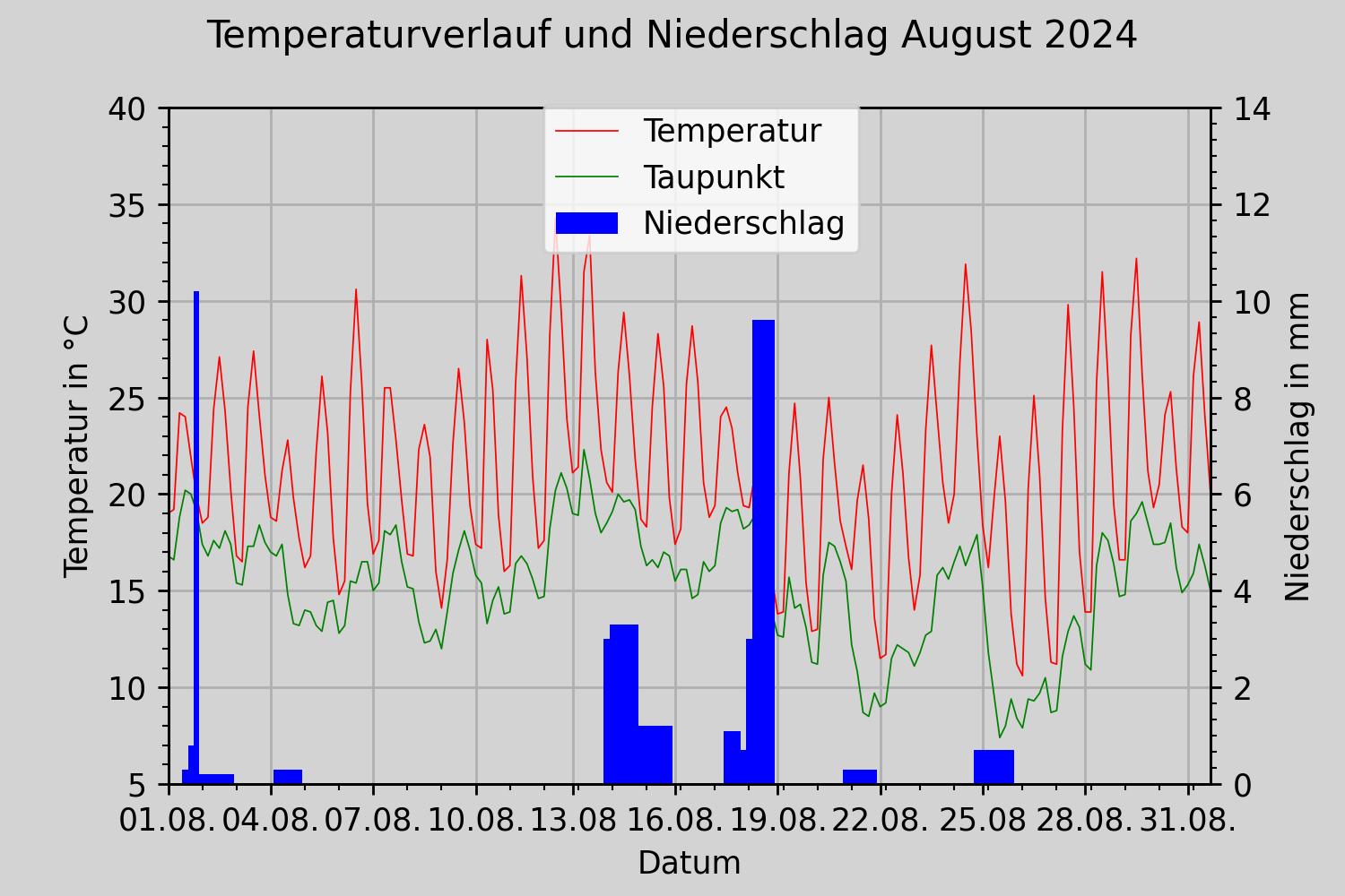 Der August war in jedem Fall ein hochsommerlicher Monat. An keinem Tag wurde die 20°C-Marke unterschritten. Zur Mitte des Monats gab es zu dem zwei Wüstentage. Die Tiefstwerte lagen meistens im