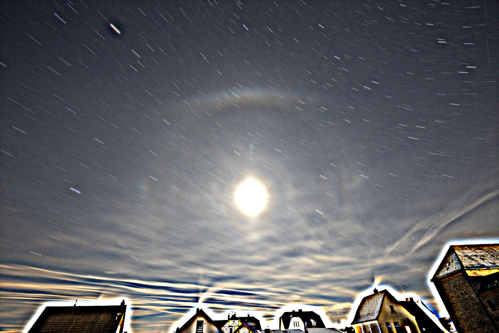 Halos gab es ein paar im Januar. Besonders auffällig war eine sehr helle rechte Nebensonne am 10. des Monats. Besonders interessant wurde es dann zum Ende des Monats, wo sich am Mond zwei Nächte sehr