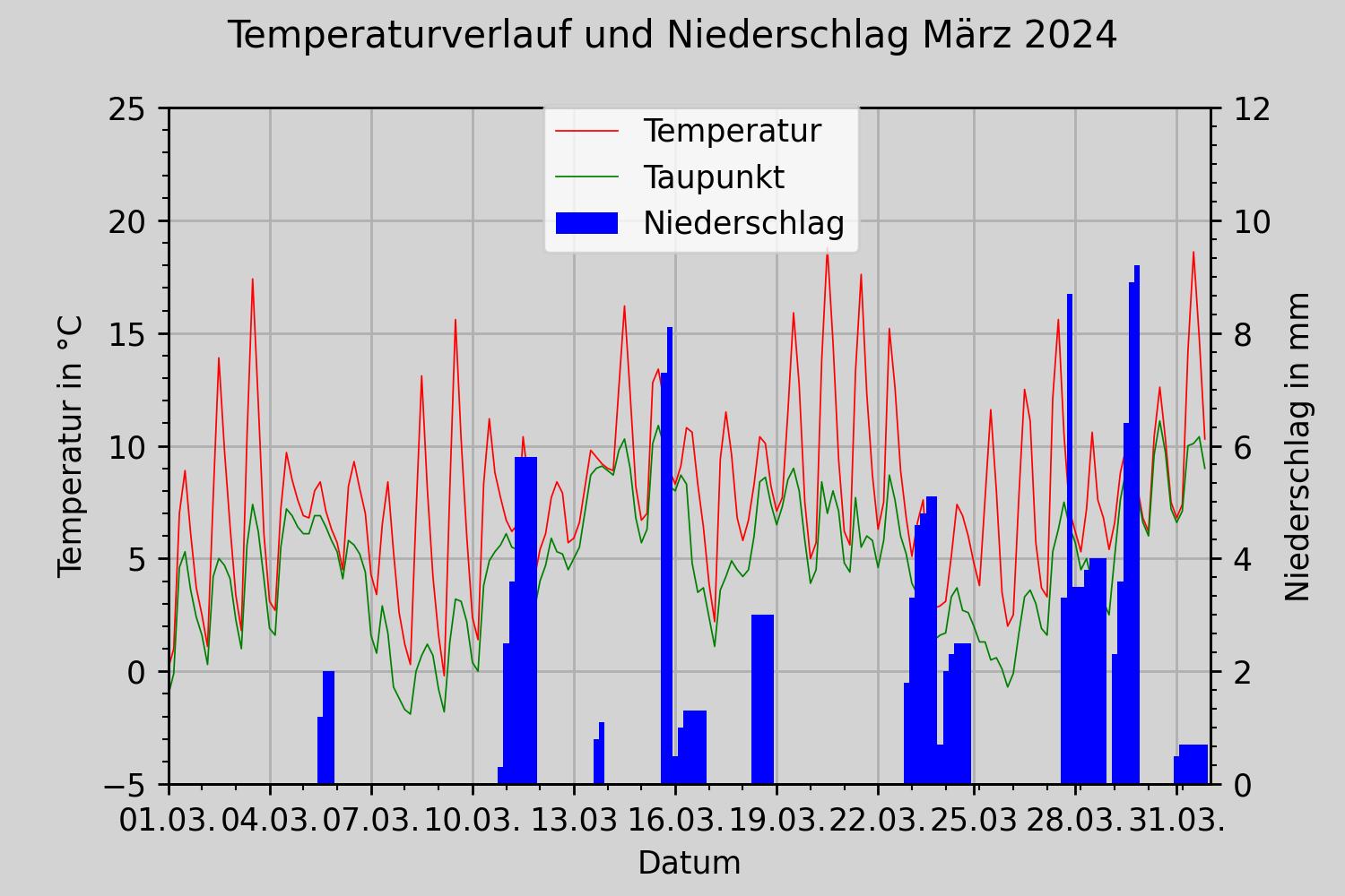 Tagesmengen blieben unter 10 mm. Am 20. des Monats wurde erstmals im Jahr die 20°C-Marke überschritten. Auch am Ende wurde es nochmals warm. Außerdem gelangte eine ordentliche Portion Saharastaub nach