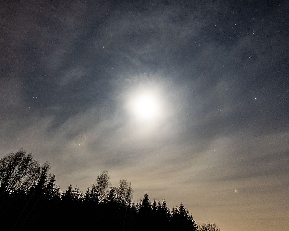 | Rechte Nebensonne 05.03. abends | 22°-Ring am Mond 09.03. |