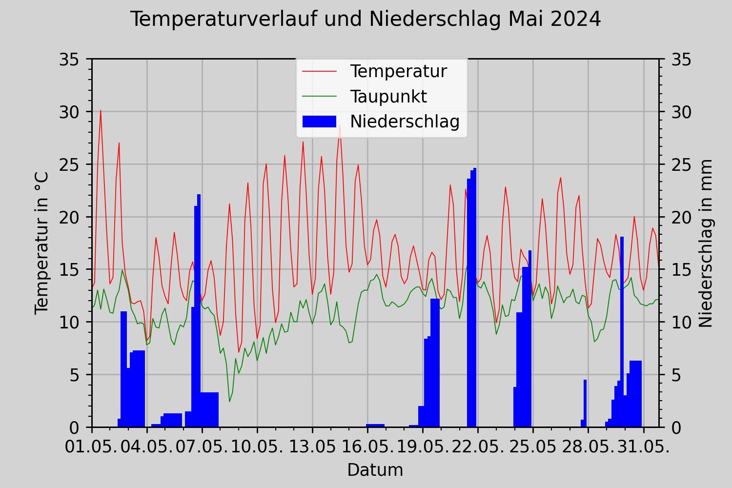 Der Mai begann heiß und teils feucht, sowie gewittrig. Bis zum 6. des Monats fiel bereits die Hälfte des Niederschlags, was normalerweise im Monat fällt. Danach stellte sich erst einmal eine