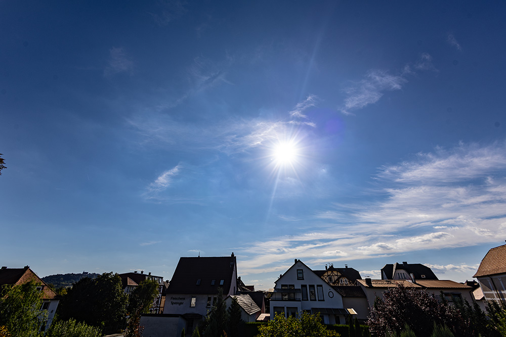 Die Tage von Hoch "Quentin" sind jetzt gezählt. Selbiges gilt für die hohen Temperaturen, welche teils über 10°C zu warm für September sind! Von Westeuropa nähert sich langsam Tief "Yonca", wobei es sich hier um ein Cutoff-Tief handelt. Dieses Tief schaufelt heute mit Hoch "Quentin" nochmals heiße Luftmassen nach Mitteleuropa. Morgen greift dann die Kaltfront des Tiefs über. In der Nacht überwiegend klar oder gering bewölkt, dieses Mal kühlte es deutlicher ab auf 14,9°C. Am Morgen dann Nebel, welcher bis zum Vormittag vollständig verschwunden war. Anschließend sonnig oder nur leicht bewölkt mit Cirrus, teils Cirrostratus und flachen Cumulus über den nahen Bergen. Natürlich wurde es abermals heiß bei Tmax = 33,8°C. Abends zeigten sich im Cirrus, bzw. Cirrostratus Halos, insbesondere die Nebensonnen (Bild). Es blieb den Abend erneut sehr lange warm. |