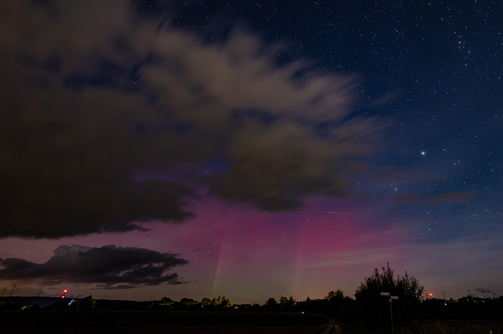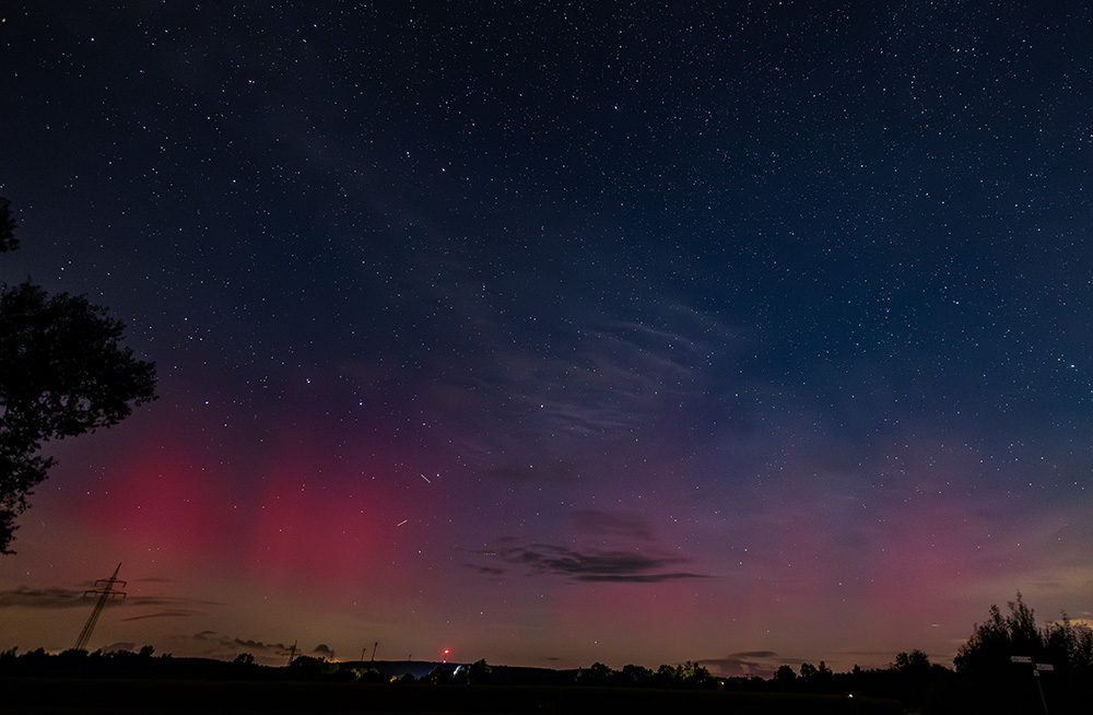 Auch heute sorgt Tief "Anett" besonders über dem Südosten Deutschlands für weitere teils ergiebige Niederschläge. Im Rest des Landes noch weiter Hochdruckeinfluss. Das Polarlicht von gestern Abend steigerte sich in der Nacht sogar noch weiter (Bild 1) und war auch visuell trotz des Mondes und einiger Wolkenfelder zu erkennen. Die Temperatur sank bis zum Morgen auf 7,3°C ab. Tagsüber dann ein Wechsel aus Sonne und Quellwolken, ab dem frühen Abend dann zunehmender Stratocumulus. Die Temperatur stieg auf 17,7°C an. Am Abend nach Sonnenuntergang gab es ein sehr auffälliges und intensiveres Abendrot, sogar mit Purpurlicht (Bild 2). |