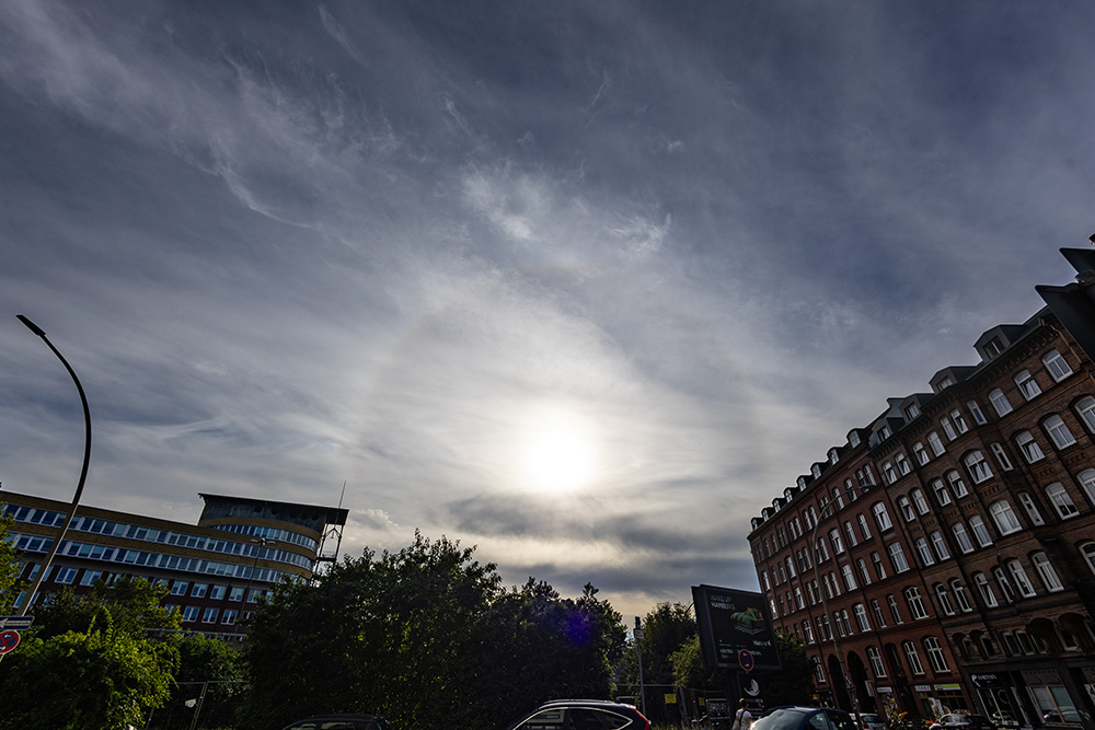 Der Tag startete wolkenlos (Bild 1), ehe von Süden Cirrus und Cirrostratus aufzogen. In den Wolken konnte am Nachmittag eine linke Nebensonne gesichtet werden (Bild 2) und am Abend gab es an der