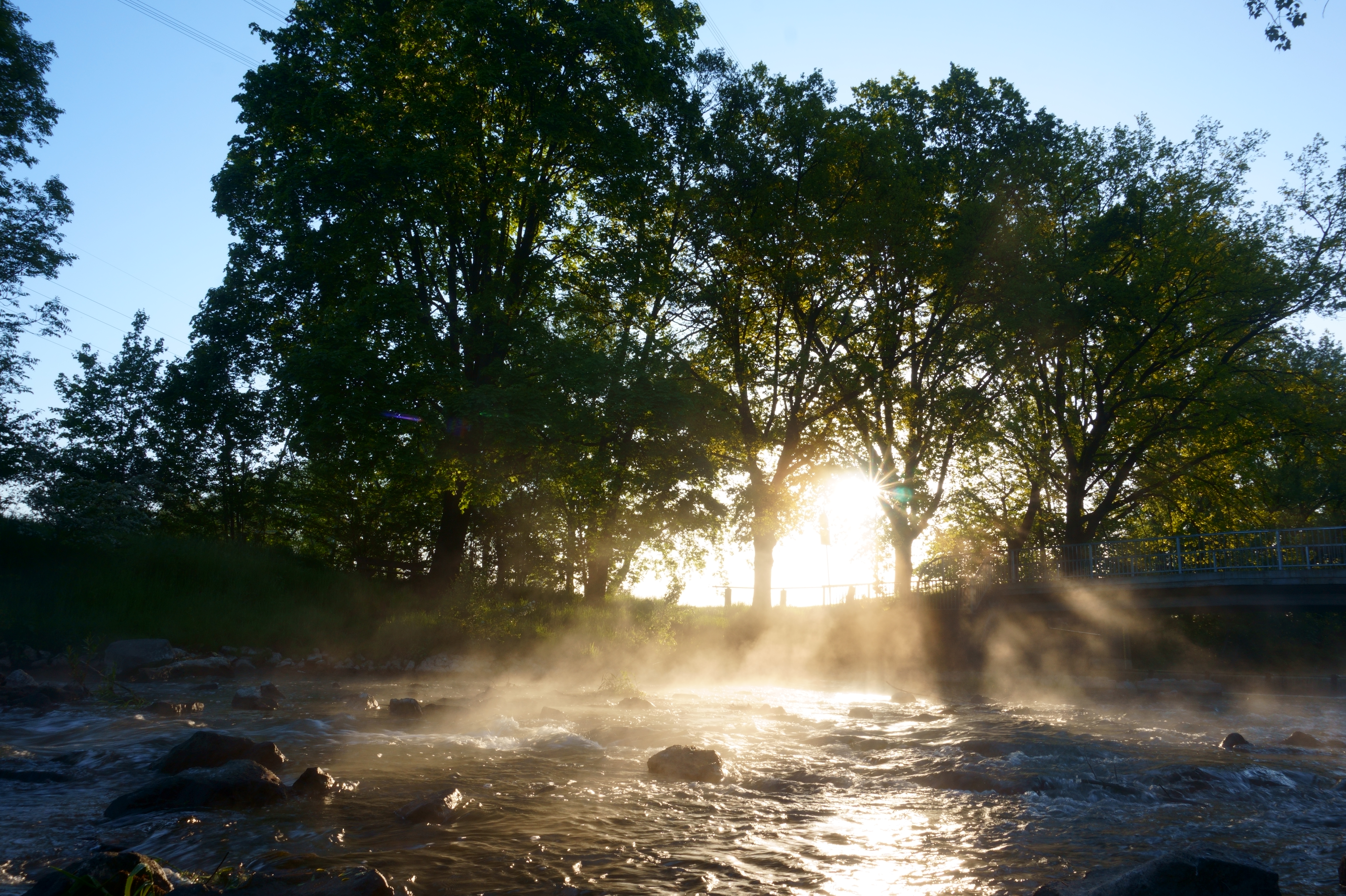 "Rauchendes" Flusswasser (Mischungsnebel) an einem Morgen nach Nachtfrost.
